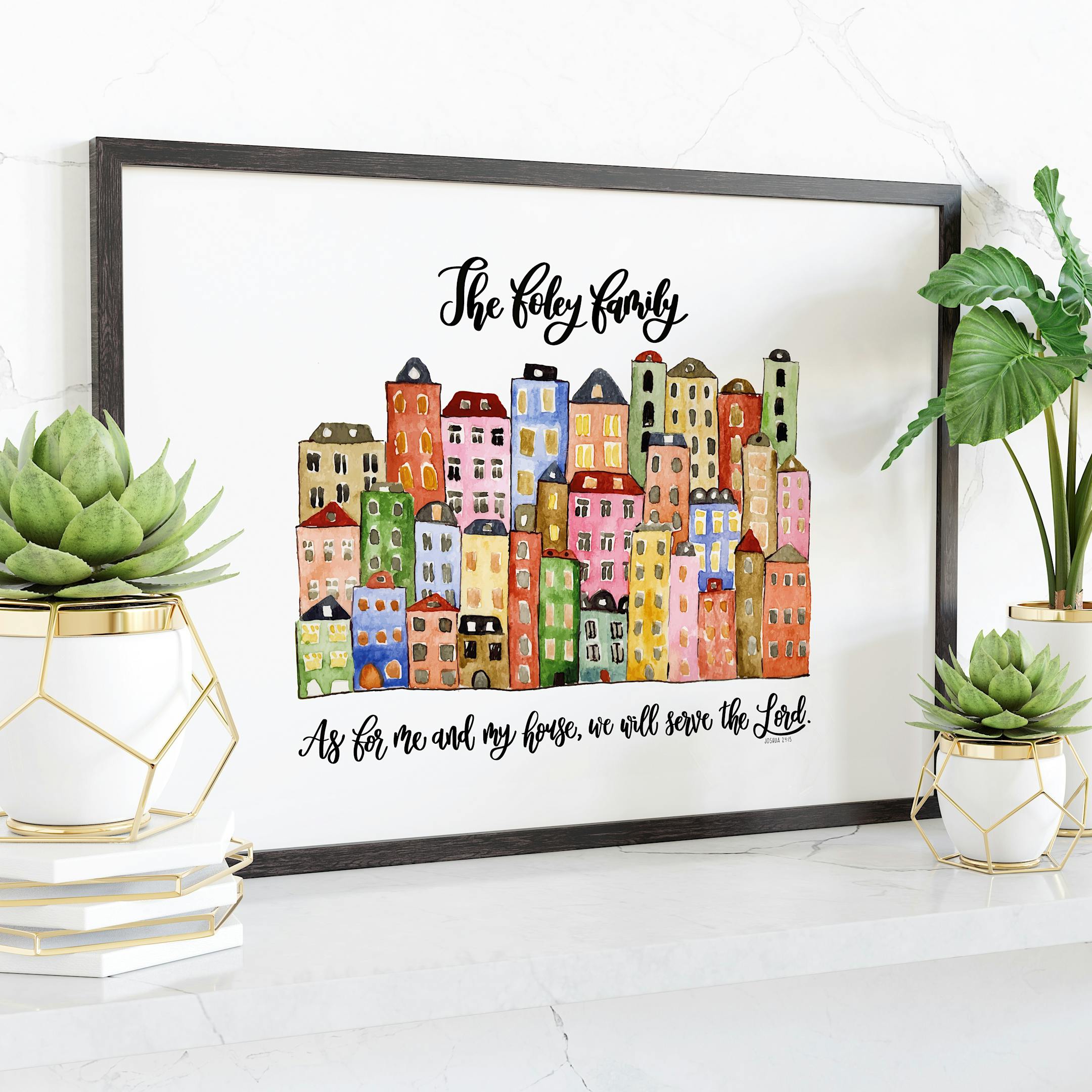 This unique and bespoke calligraphy print features the hand-lettered bible verse from Joshua 24:15, "As for me and my house, we will serve the Lord", alongside the hand-written family name of your choice. The calligraphy is complimented with the watercolour house/neighbourhood illustration, creating a stunning and inspirational piece. This is a custom print that will no doubt be cherished fo years to come, whether something inspirational to add to you own home deco or a beautifully personal gift for someone, this is a special keepsake print.