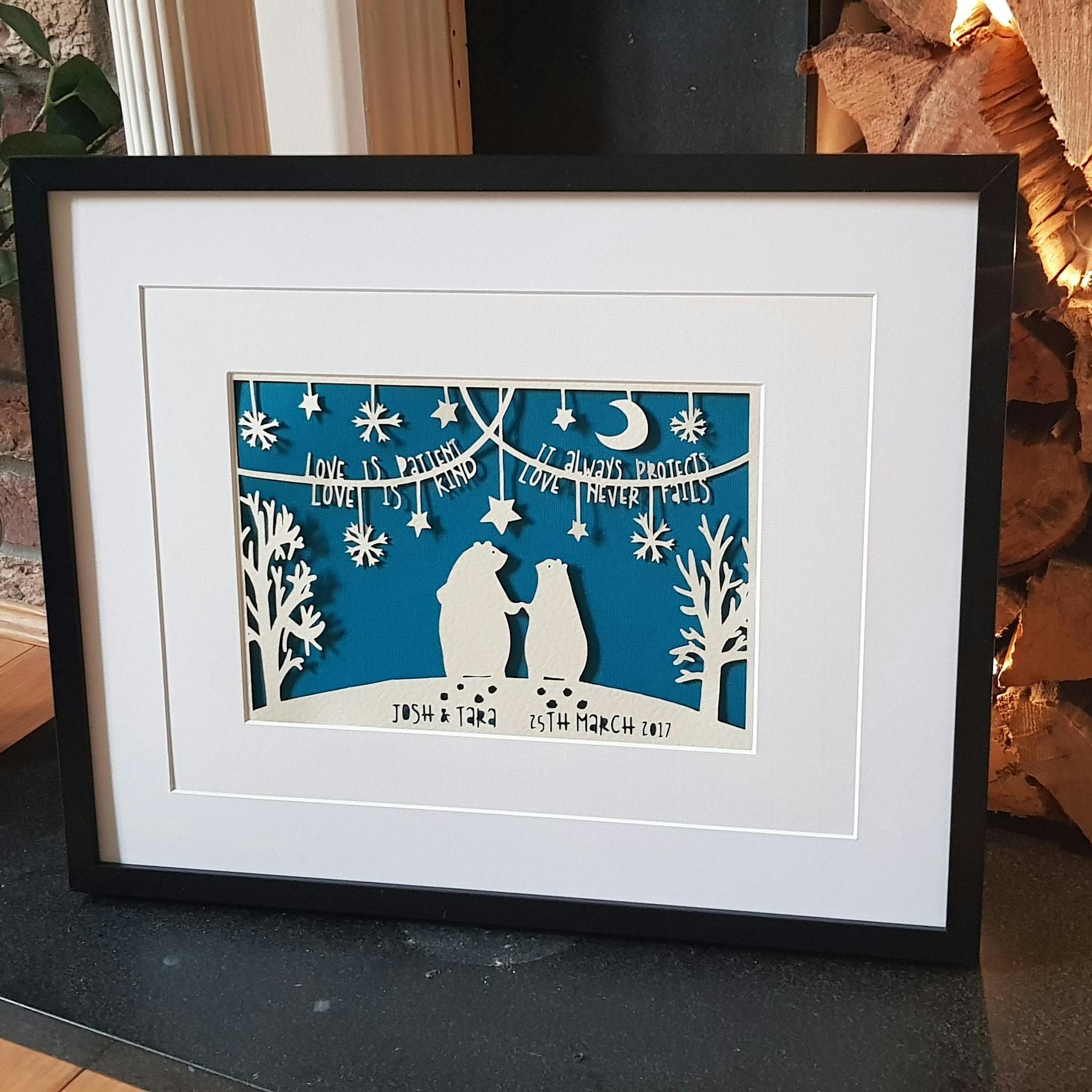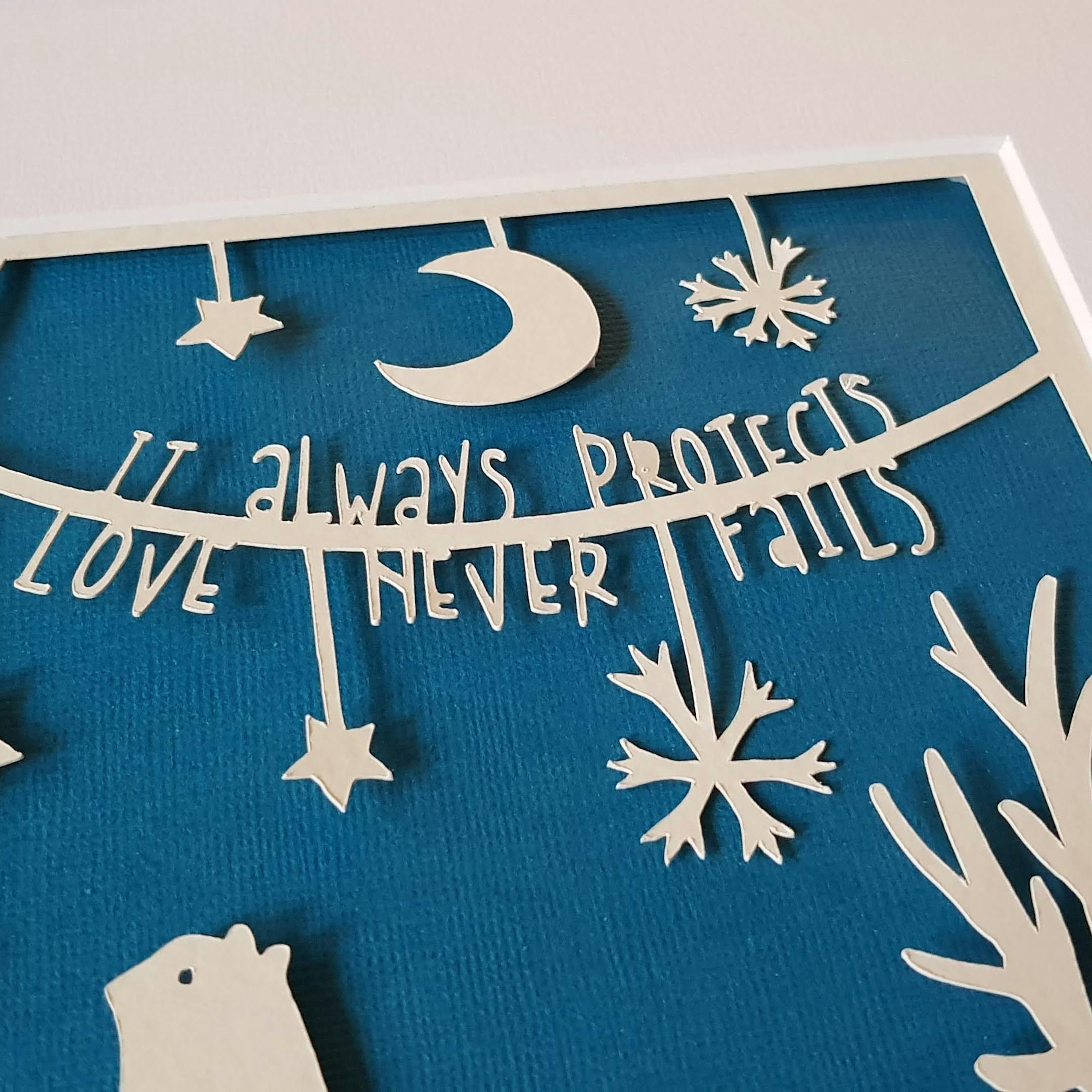 Design - "Love is patient. Love is kind. It always protects. Love never fails". Two bears cut on white card raised against your choice of background.