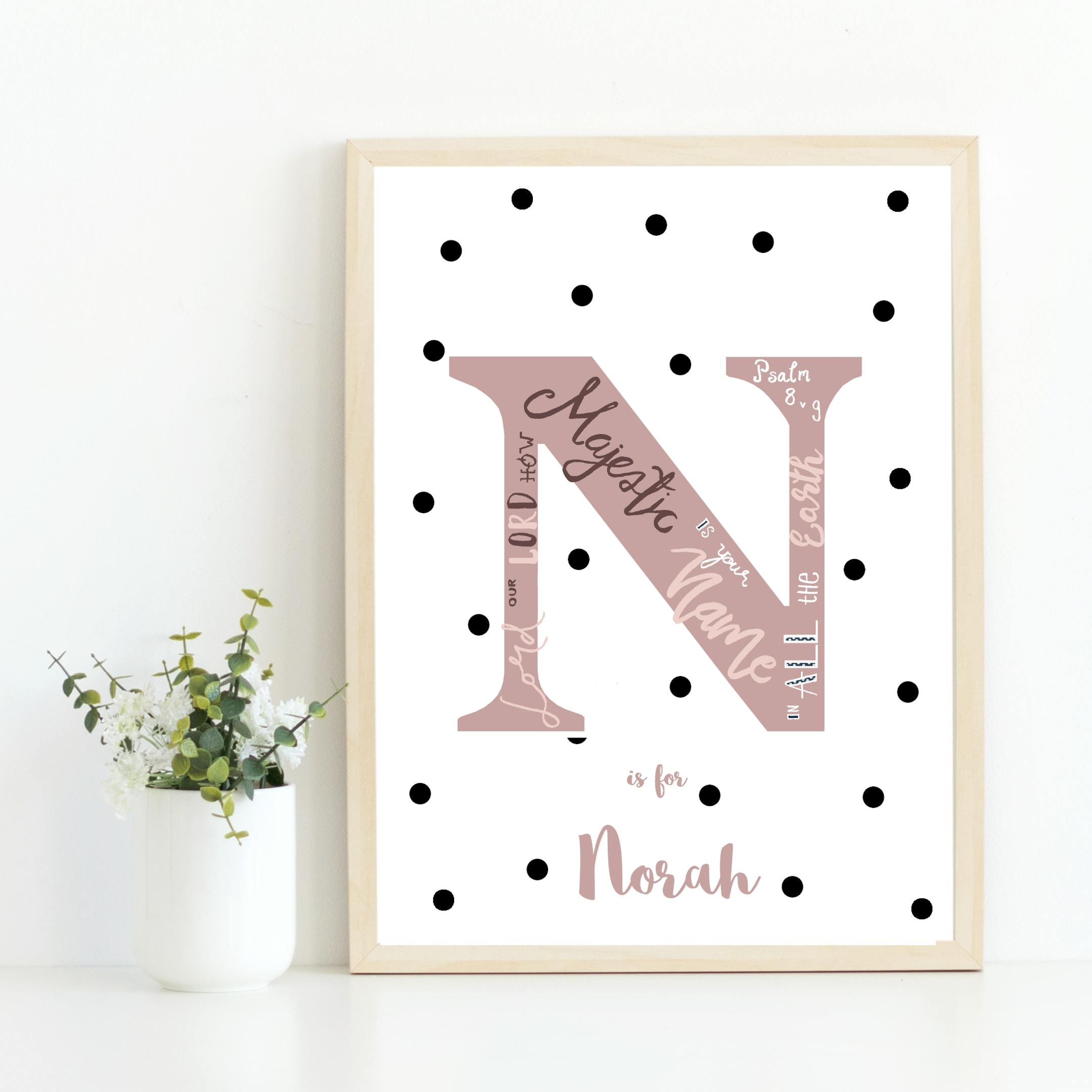 These prints come in a range of colour options. Please see the accompanying picture to preview each colour and letter. In the "notes" section please add which combination of colour, letter & name you'd like, along with your email address so a mock up can be sent to you.