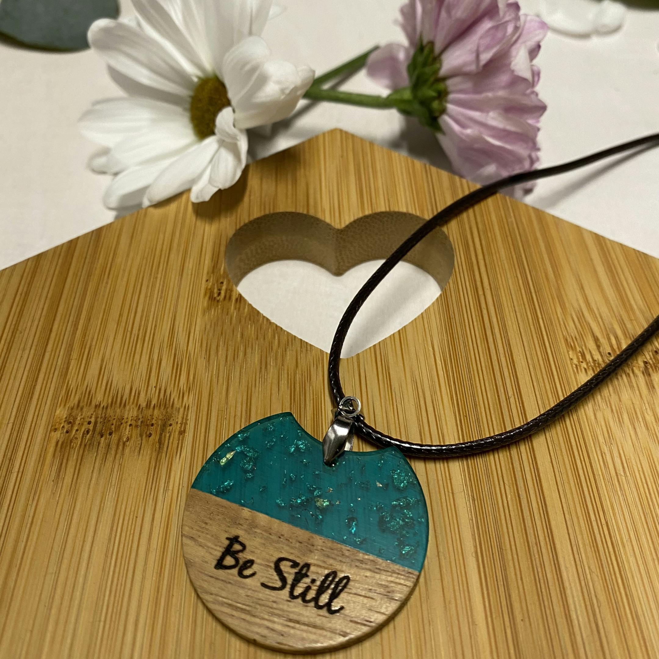 This necklace consists of a brown leather like cord and teal with silver fleck resin and wood pendant finished with your chosen word engraved on the wood, if you have a different word or verse on your pendant please select 'custom' from the drop down menu. (Maximum of 12 charactors)