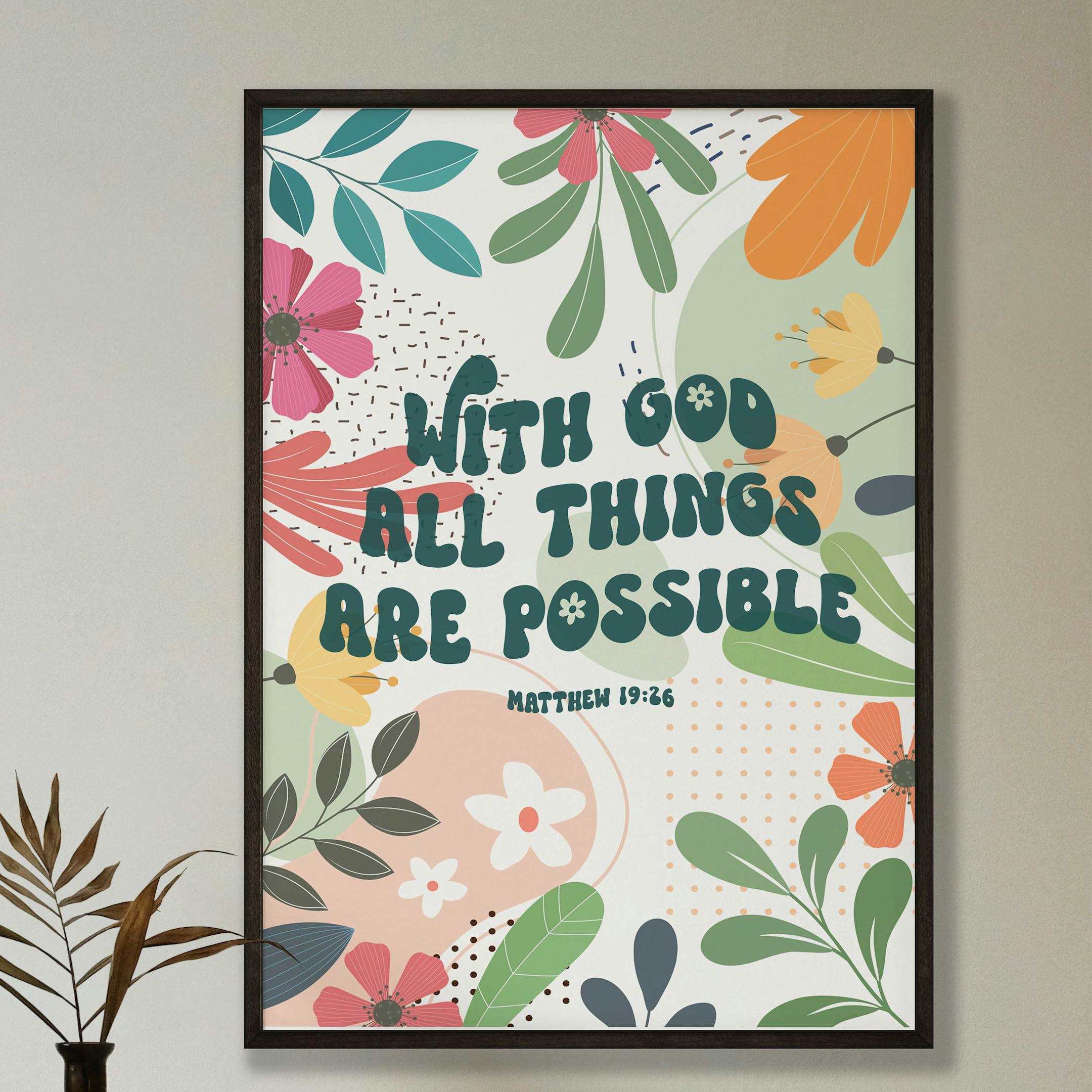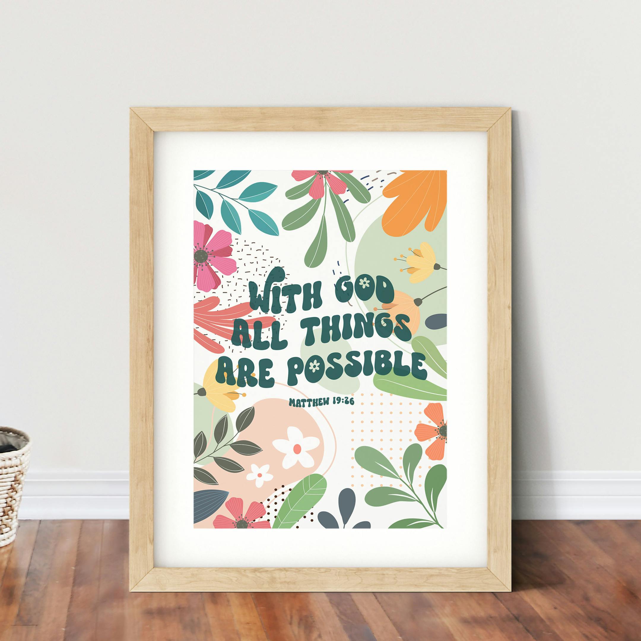 With God All Things Are Possible Retro Floral Christian Art Print - Matthew 19:26