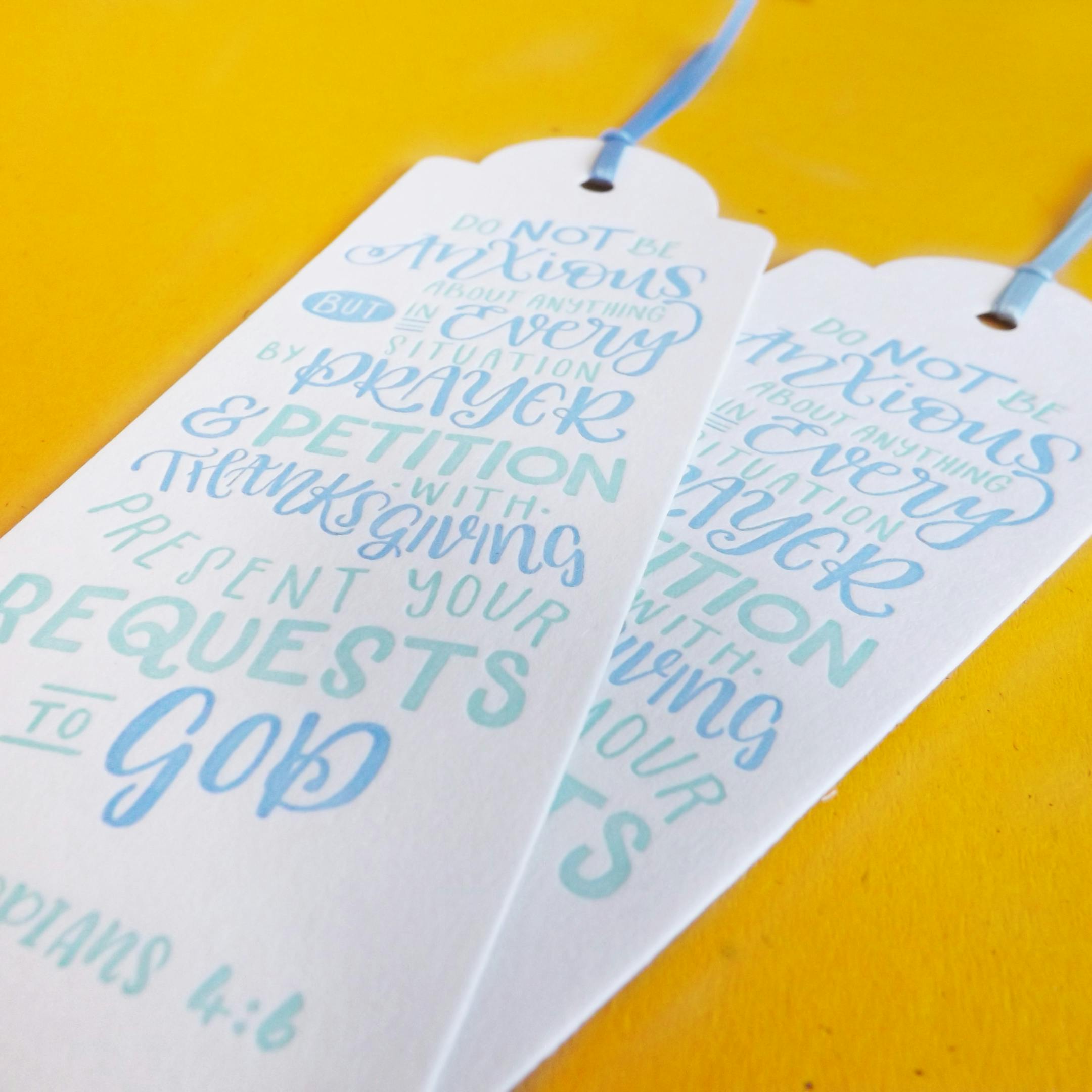 A beautiful letterpress bookmark featuring the amazing truth of Philippians 4:6.