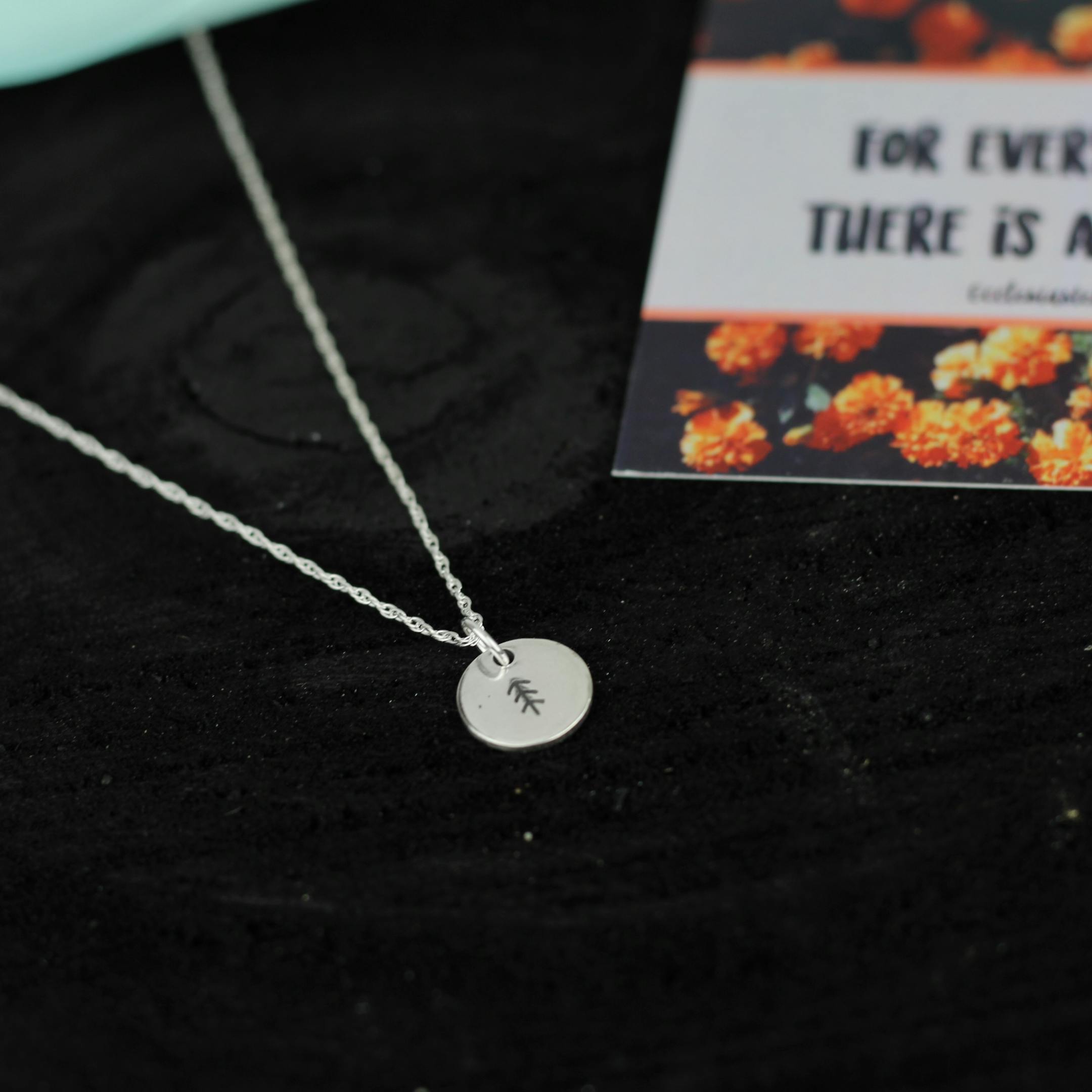 Hand-stamped sterling silver pine tree necklace on a 16" chain. Accompanying verse card reads: "For everything there is a season".