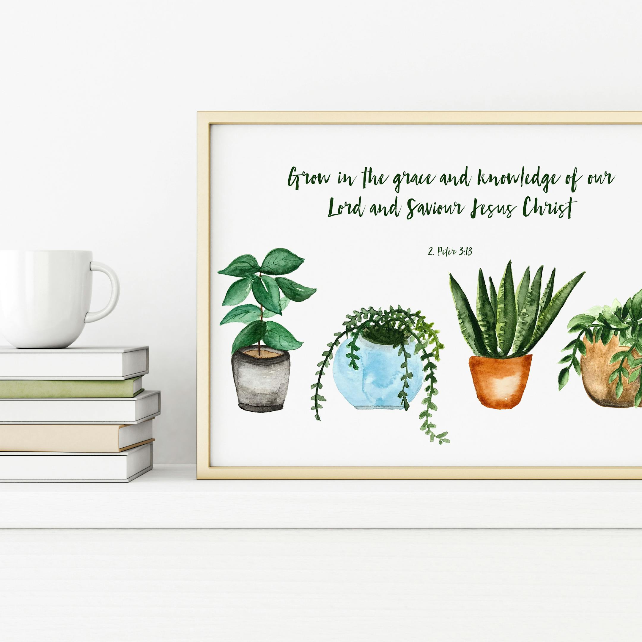 You could put it in a frame or hang it just as it is, and it will complement any decor style in various rooms. This painting was inspired by the bible verse in 2.Peter 3:18, reminding us to grow in grace and knowledge. I was reminded of this when watering the 4 house plants painted on this art print.