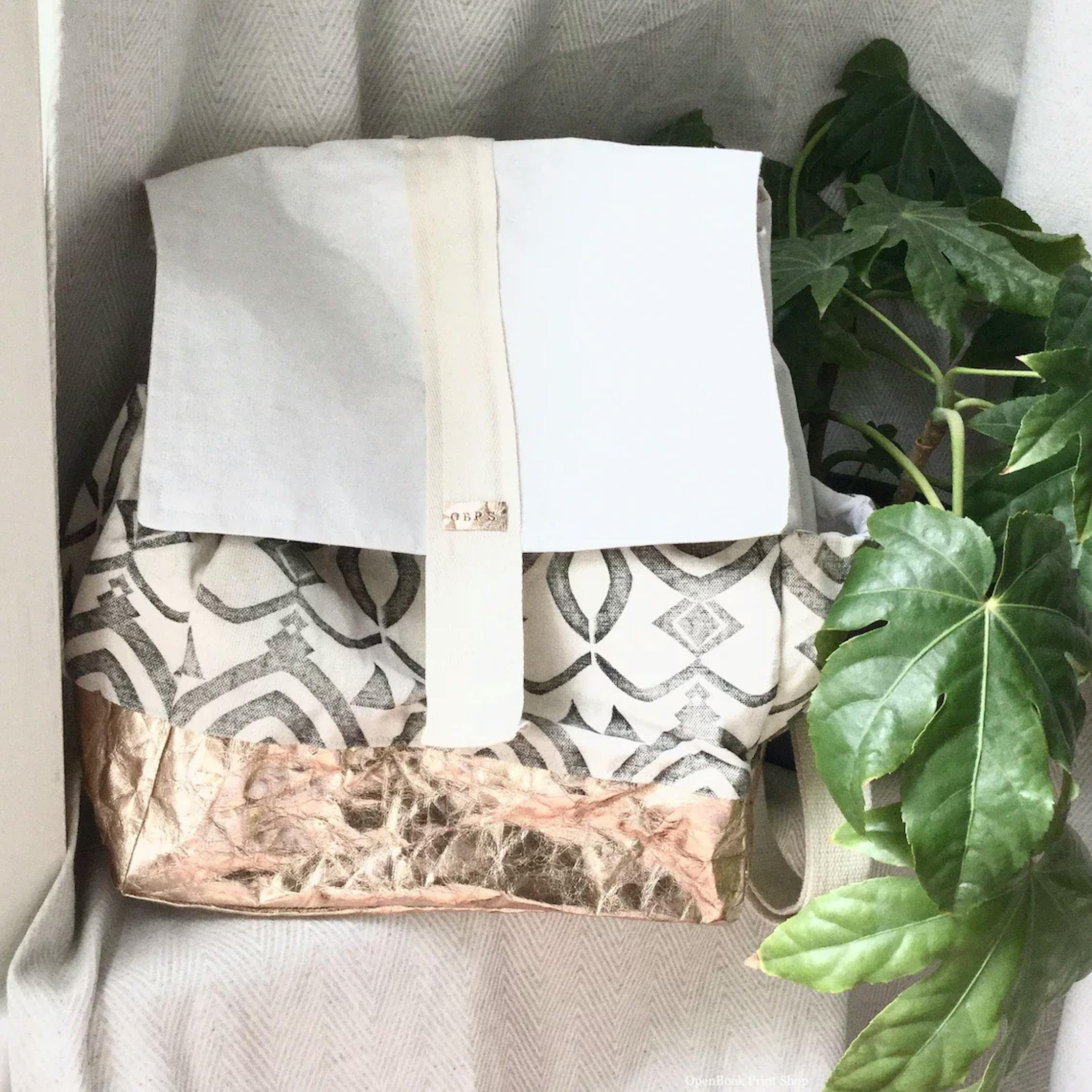 This exotic looking backpack is for anyone who wants take care of our planet in style. Perfect for travel, a city getaway, a beach trip, or even just a fun day out, these bags bring a healthy dose of sustainability to your life in a fashion forward way. This backpack is lightweight but heavy duty. Each features a handprinted monochrome cotton linen fabric body and side pockets, a metallic rose gold paper leather base, and a white cotton linen back and closing flap. Inside, they are lined with Egyptian cotton, and to finish off, they have 100 percent cotton straps and hand braided pull cords.
