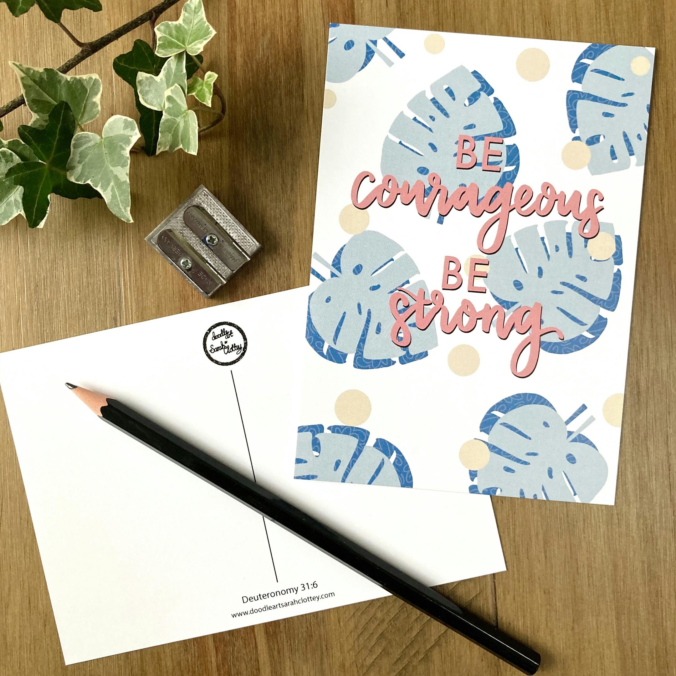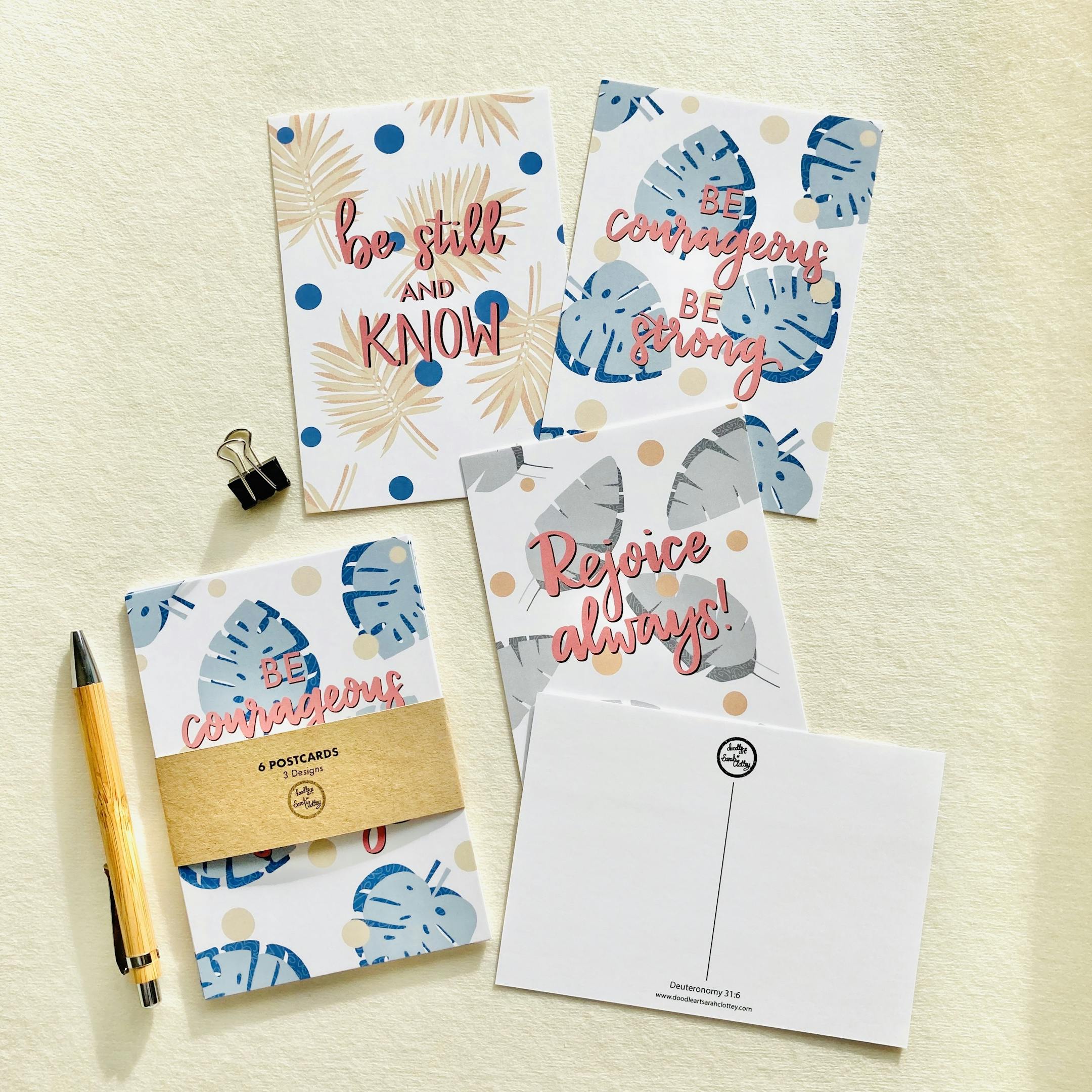 There are three designs which read ‘Be Courageous Be Strong’, ‘Be Still and Know’, and ‘Rejoice Always’ in pink brush script calligraphy. Each one has a tropical leaf and spotty patterned backdrop, created in a calming pastel colour palette.