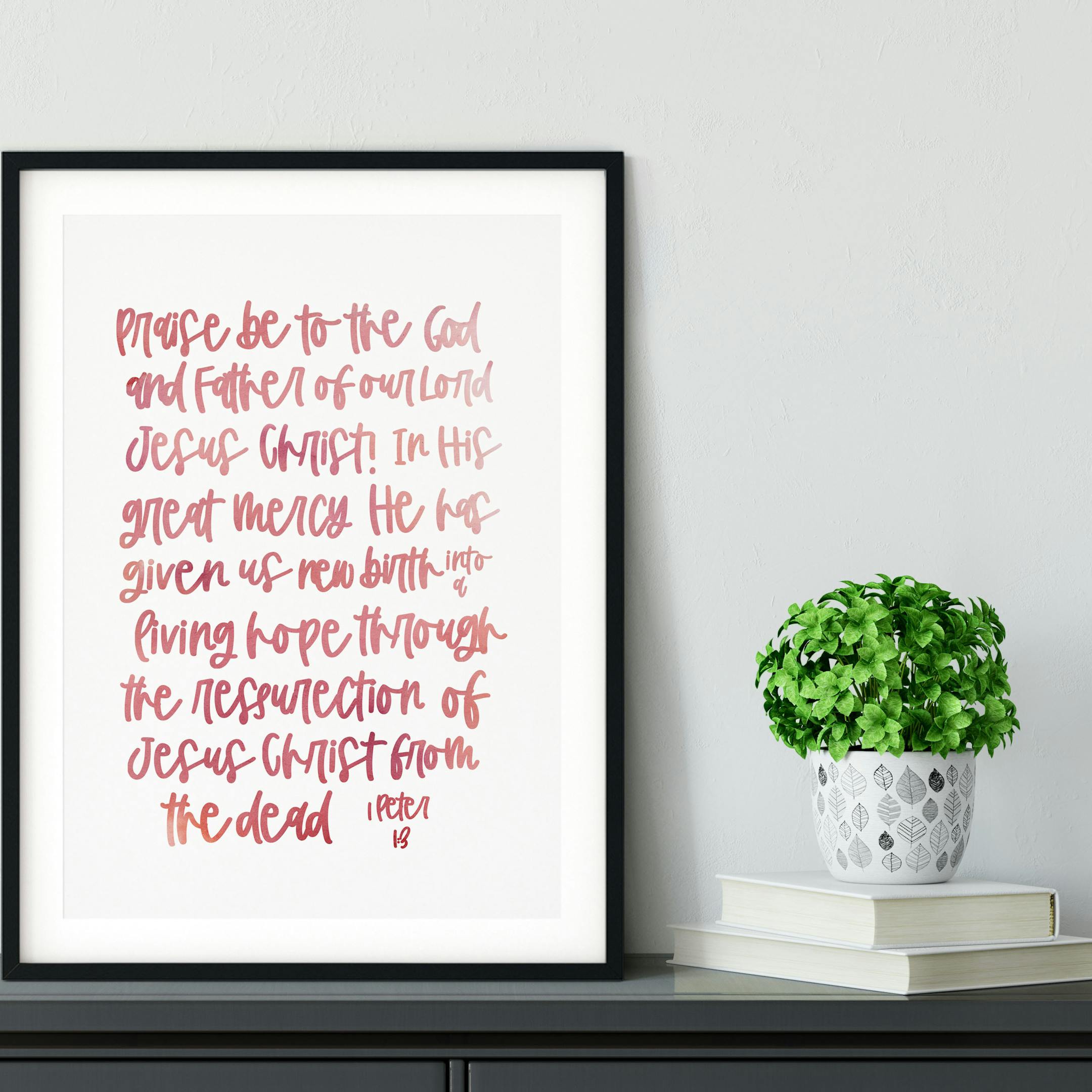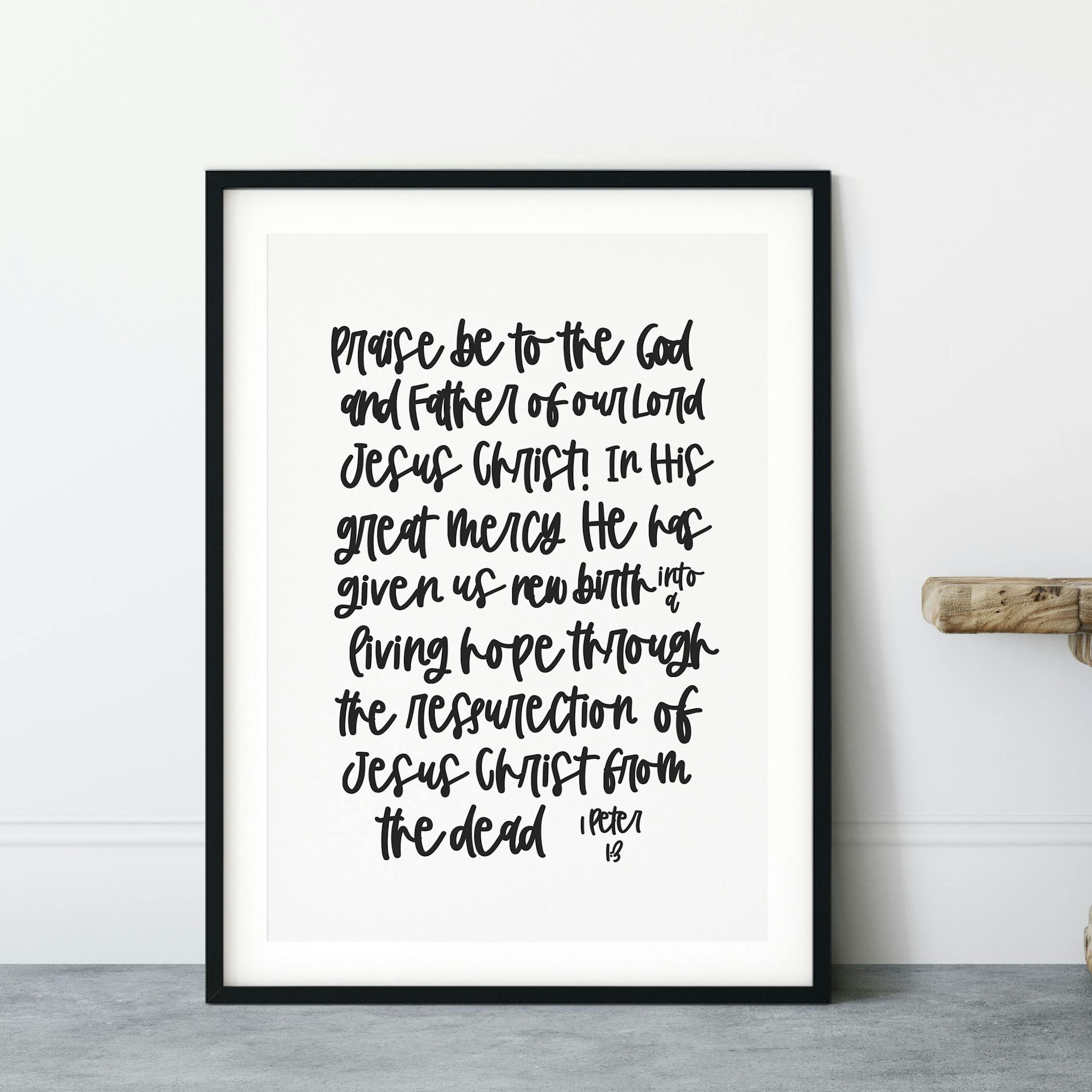 This beautiful Christian Art Print features the wonderful verses from 1 Peter 1:3, in gorgeous, modern, bold lettering. Lovingly created, this print would look great on a wall or a mantle or desk top.