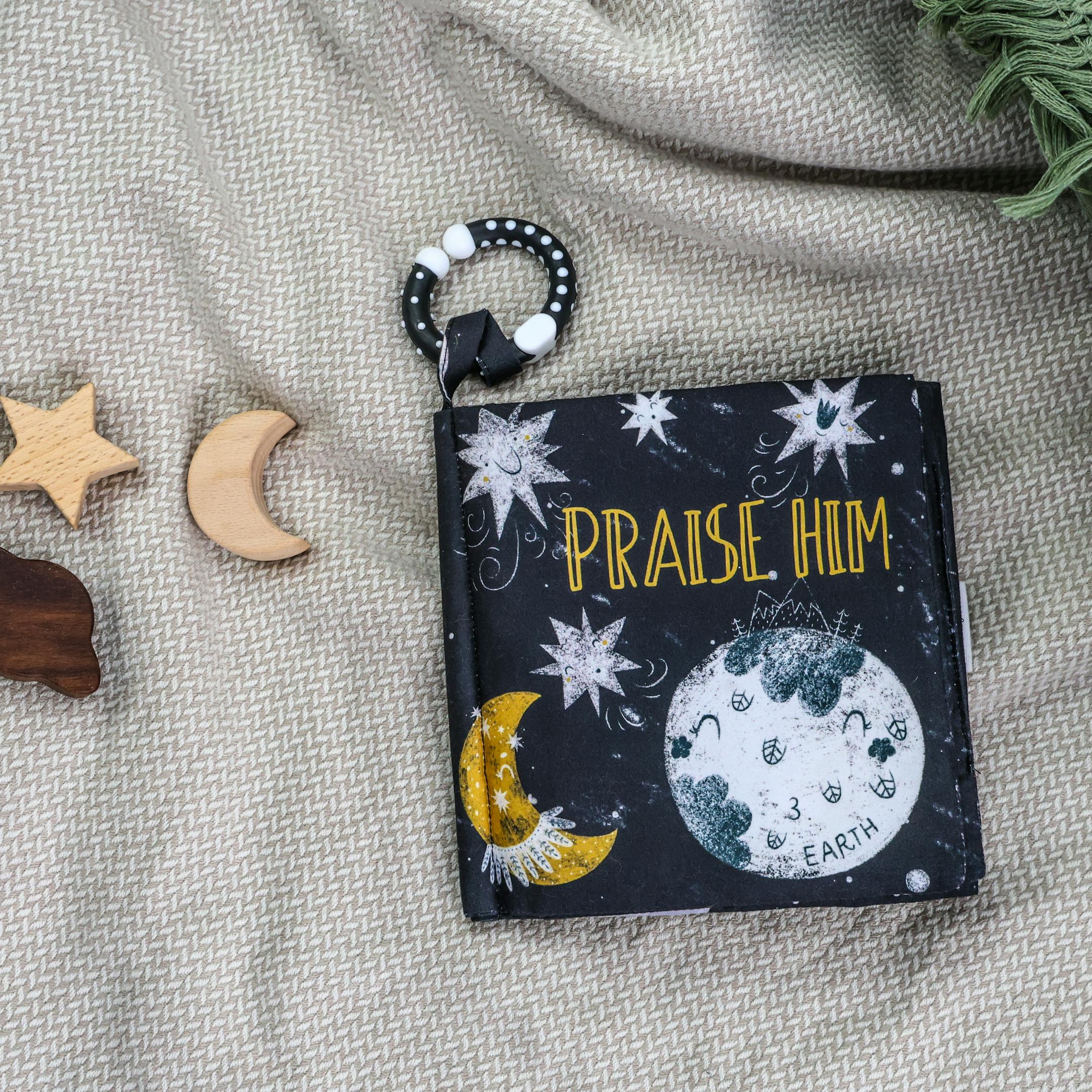 Praise Him baby crinkle book with pram attachment teething ring.