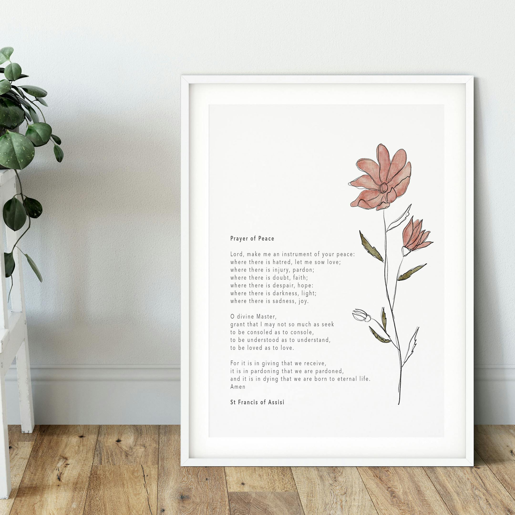 A lovely, contemporary, minimalist Art Print that features a soft pink watercolour floral design together with the wonderful prayer of St Francis Of Assisi.