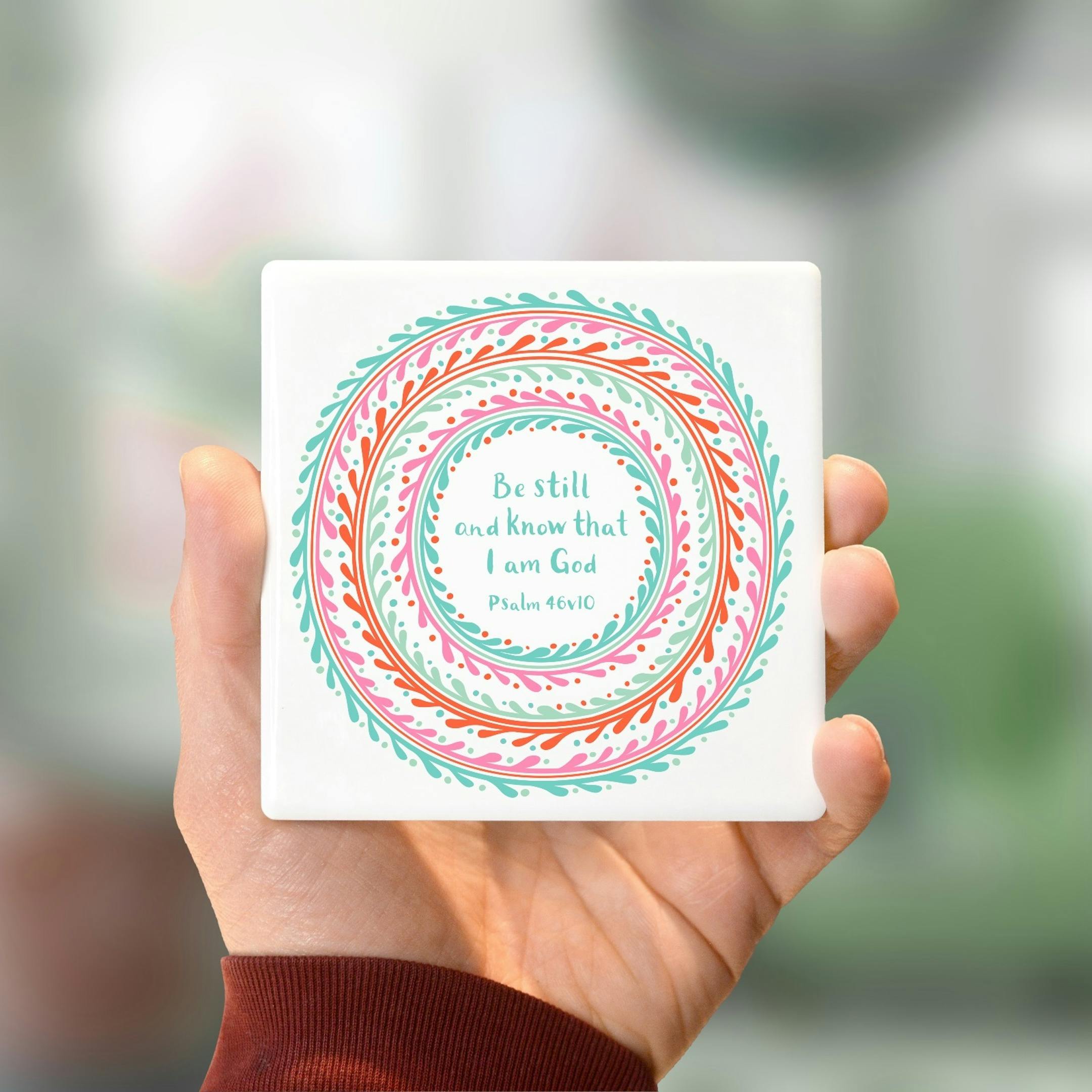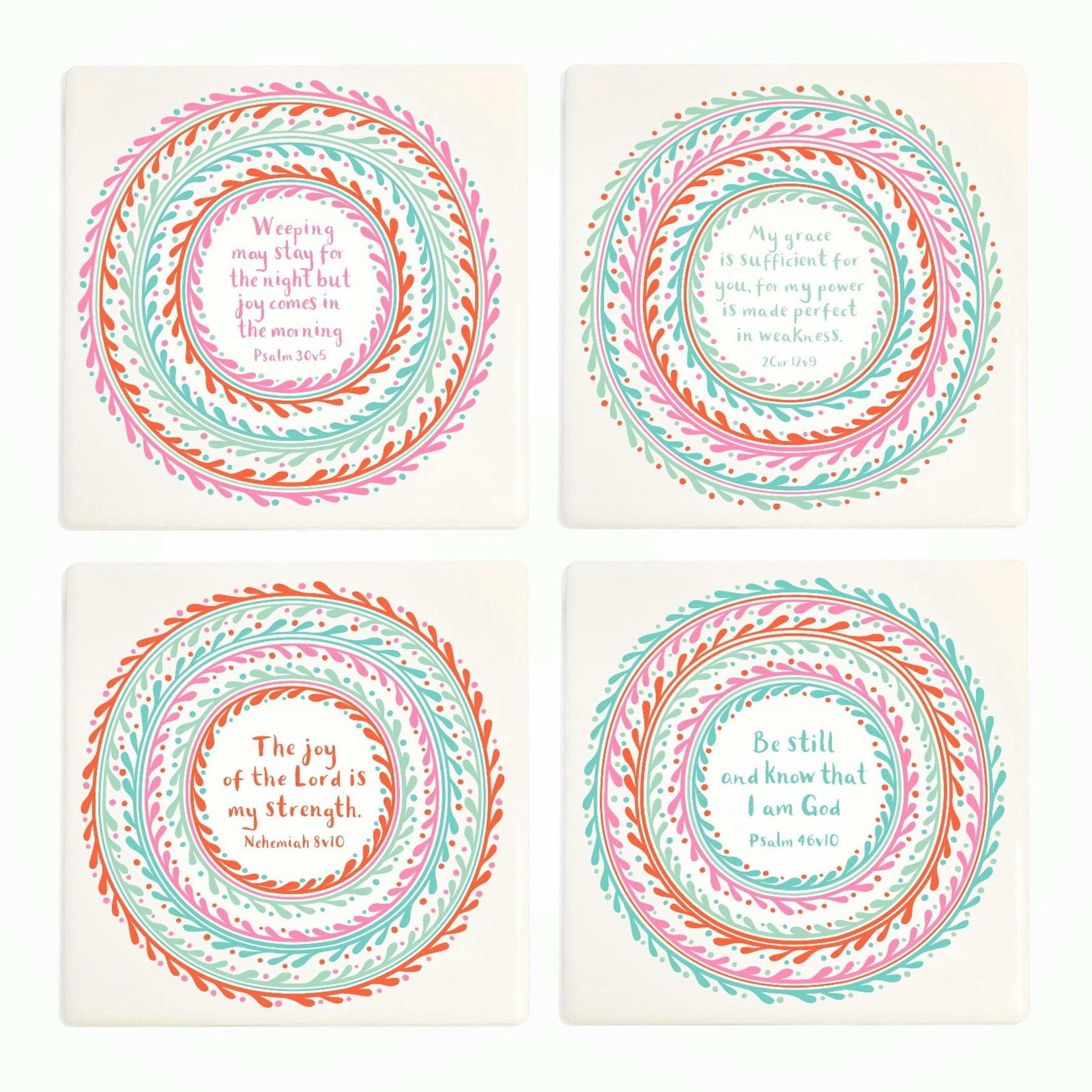 A set of four chunky ceramic coasters, each with a different encouragement from the Bible. Use the drop-down menu to choose individual designs or the whole set.
