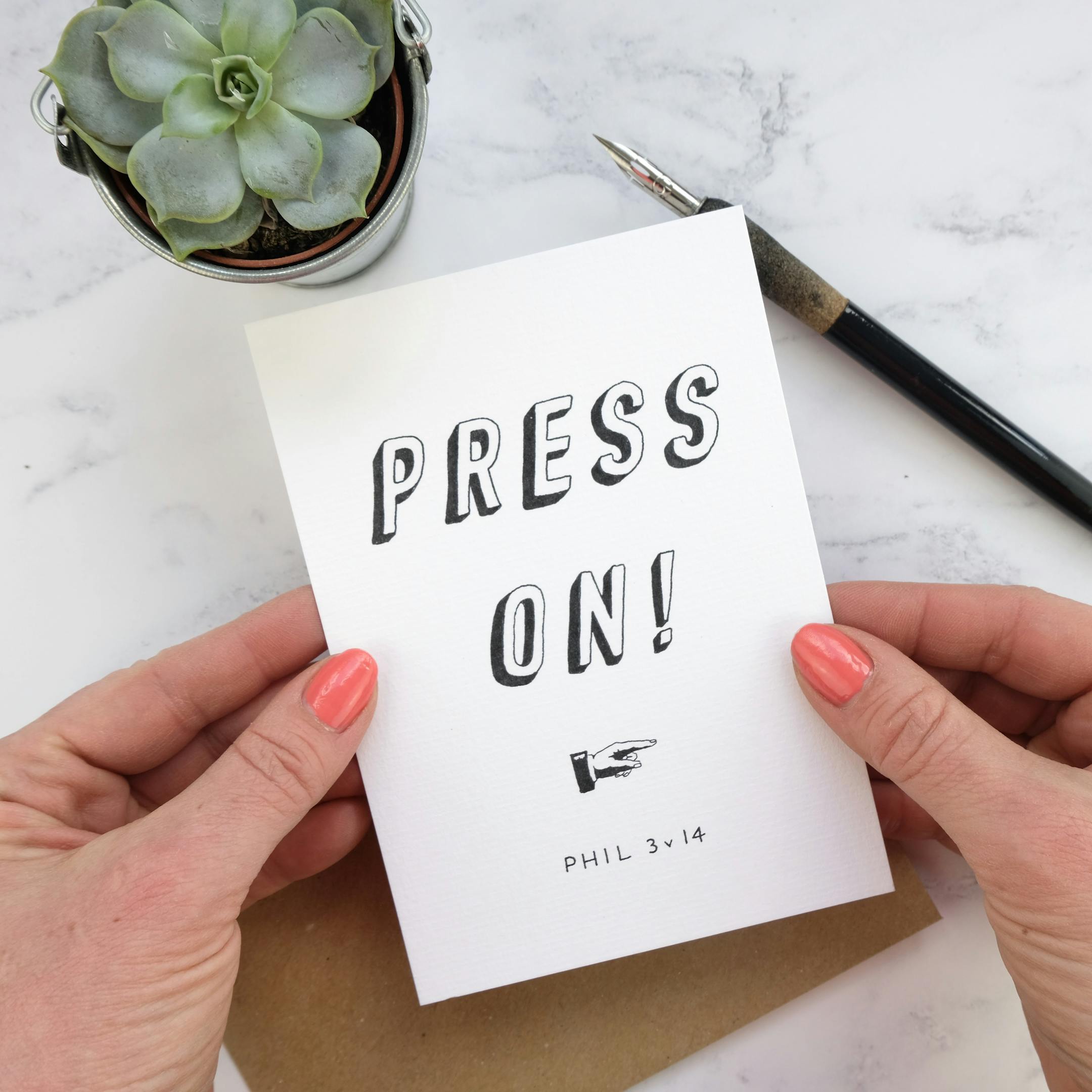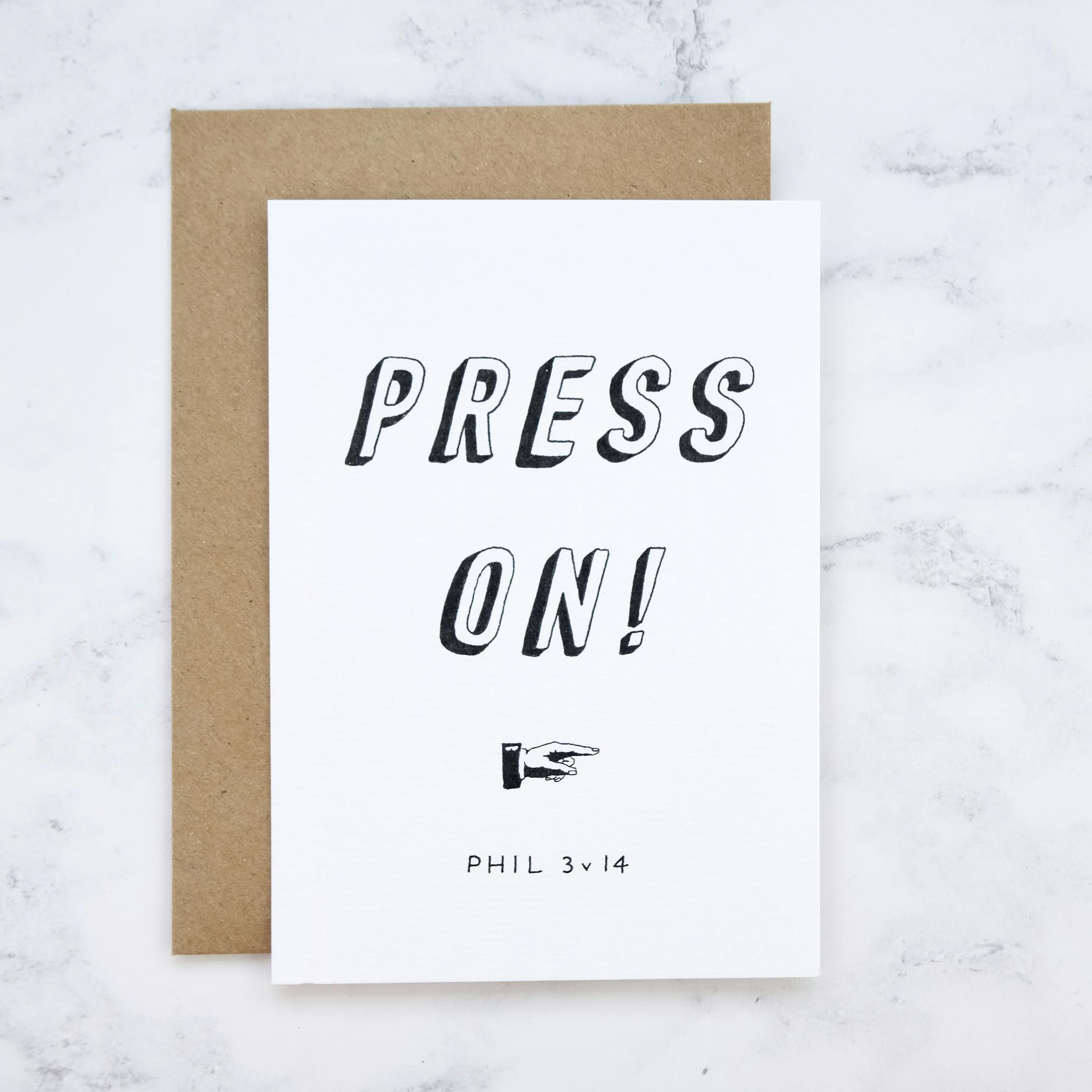 Encourage your friends to keep going with this encouraging postcard. The hand lettered illustration quotes a verse from Philippians, printed on luxury card.