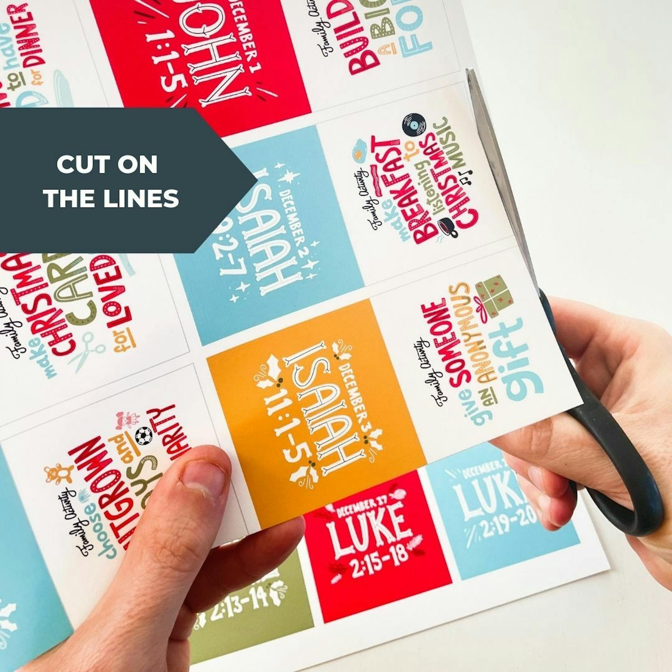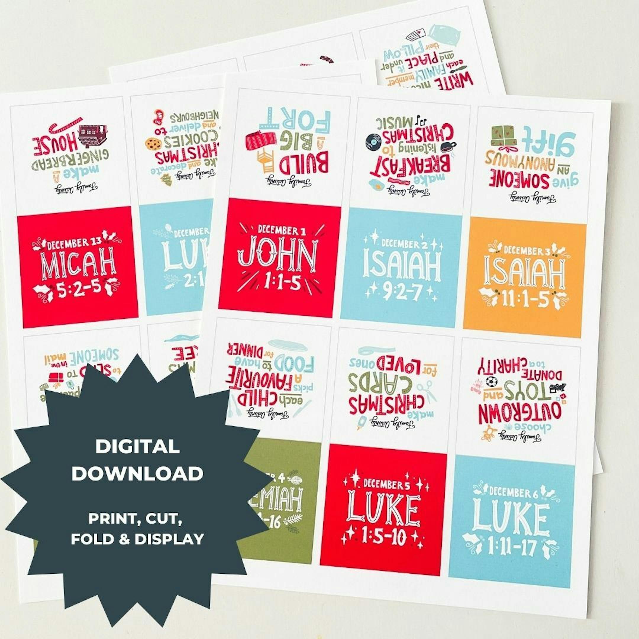 A PDF download to print at home, cut and fold with 25 folded cards that include 25 Bible verses and 25 family activities. The download also includes instructions for printing, cutting and folding.