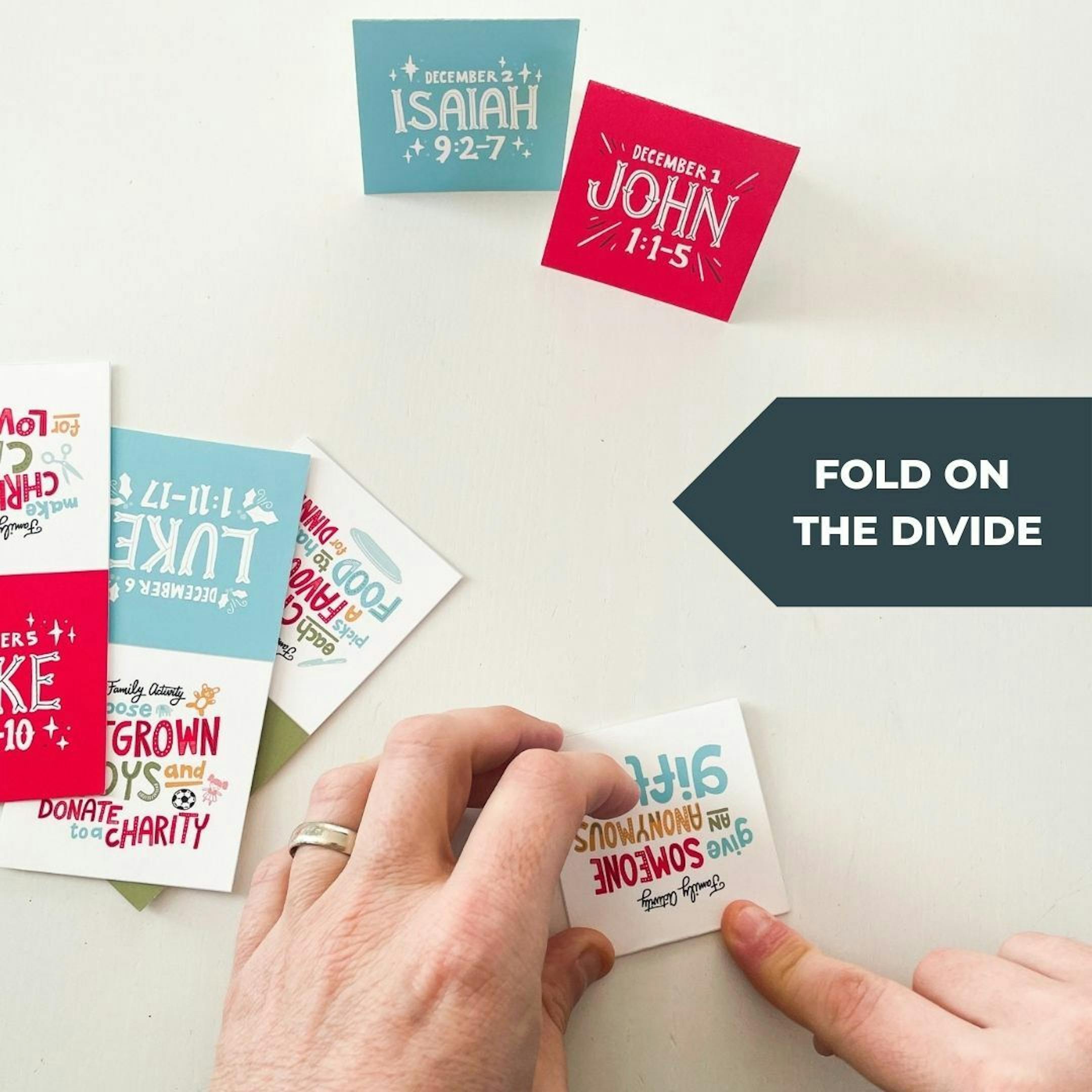 Each foldable card in the calendar features a Bible verse on one side and a family activity on the other side to spend quality time together and to help others in your community.