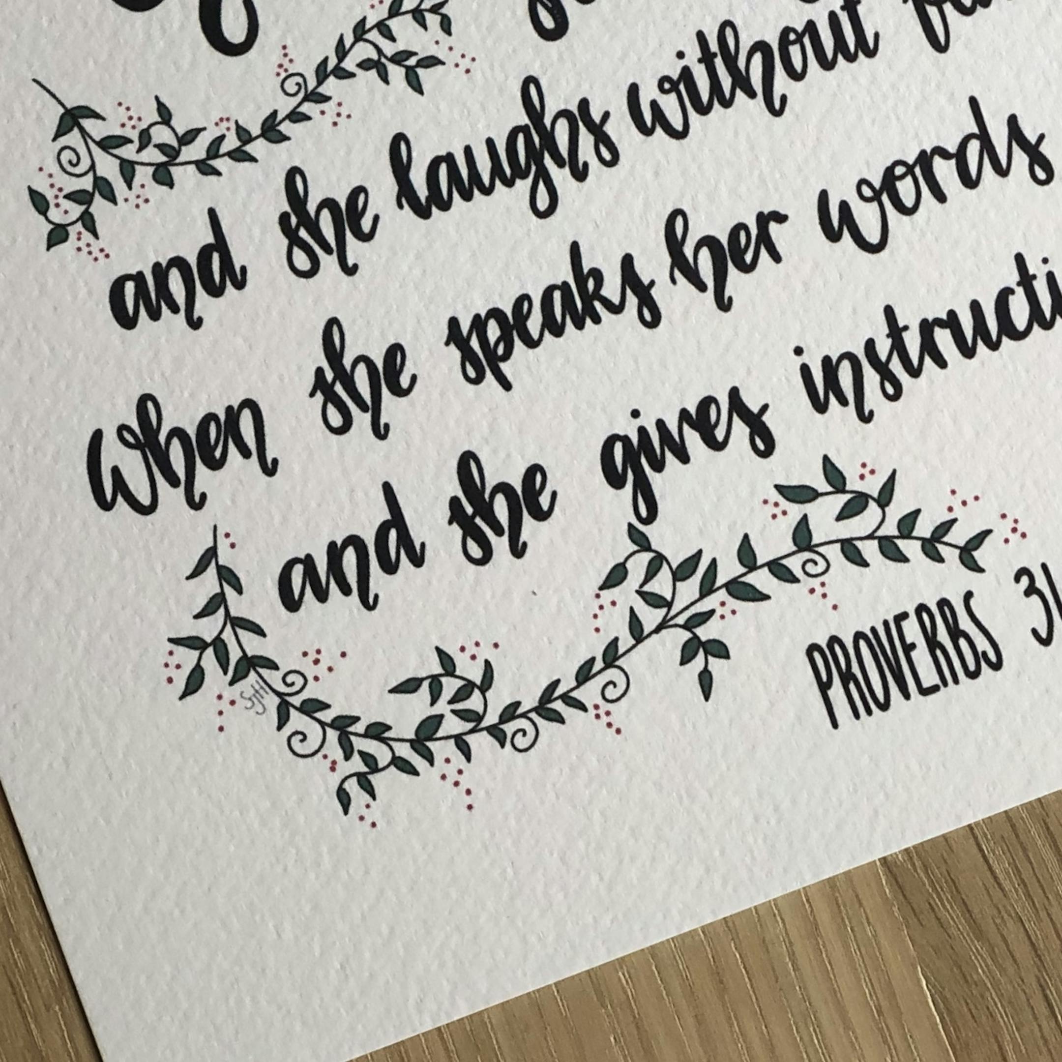 This beautiful UNFRAMED print is my original hand lettered design of Proverbs 31 hand lettered print. ‘She is clothed in strength and dignity and she laughs without fear of the future. When she speaks her words are wise and she gives instructions with kindness.’