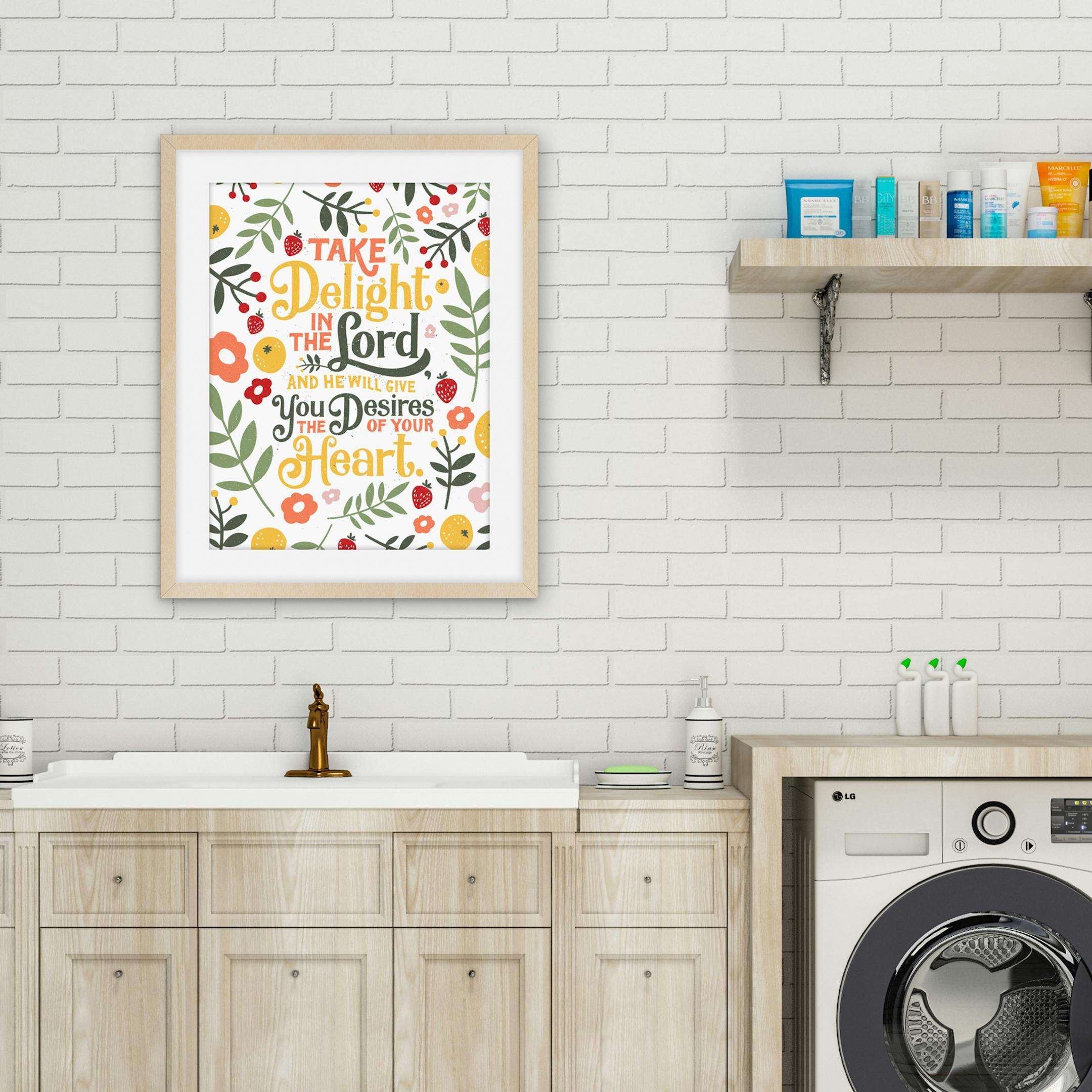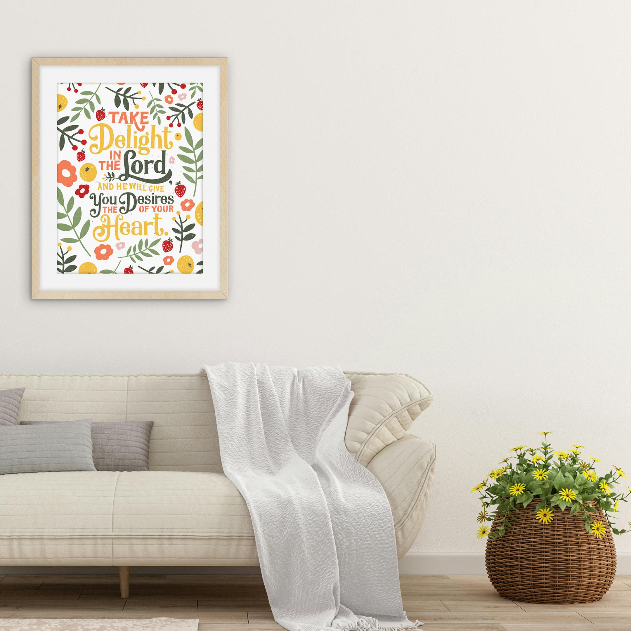 This hand lettered Christian wall art features the Bible verse Psalm 37:4 "Take delight in the Lord and he will give you the desires of your heart." This print is a beautiful encouragement gift.