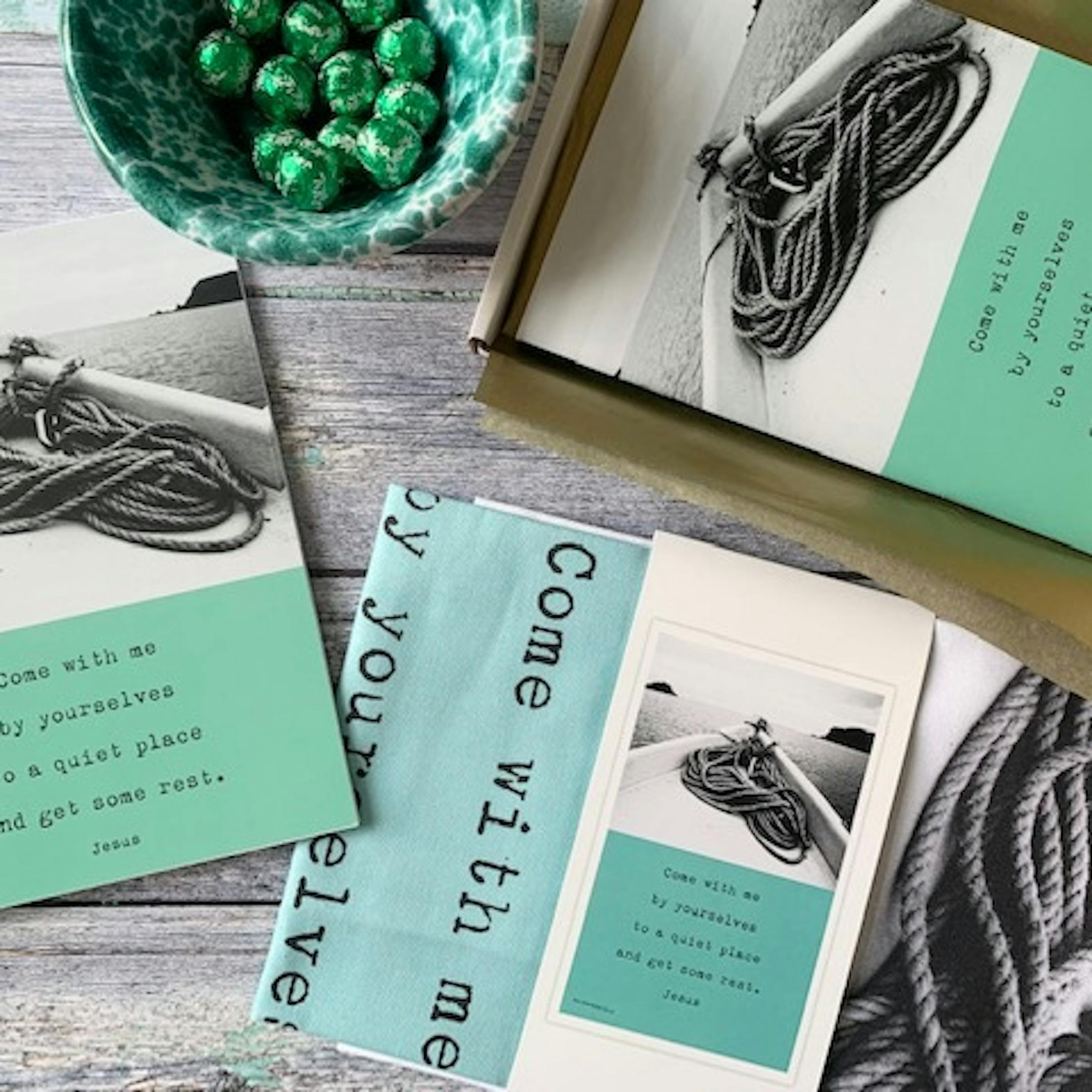 This coastal bundle contains the Quiet Place A5 lined Notebook in aqua and matching Tea Towel, all done up with minty chocolates.
