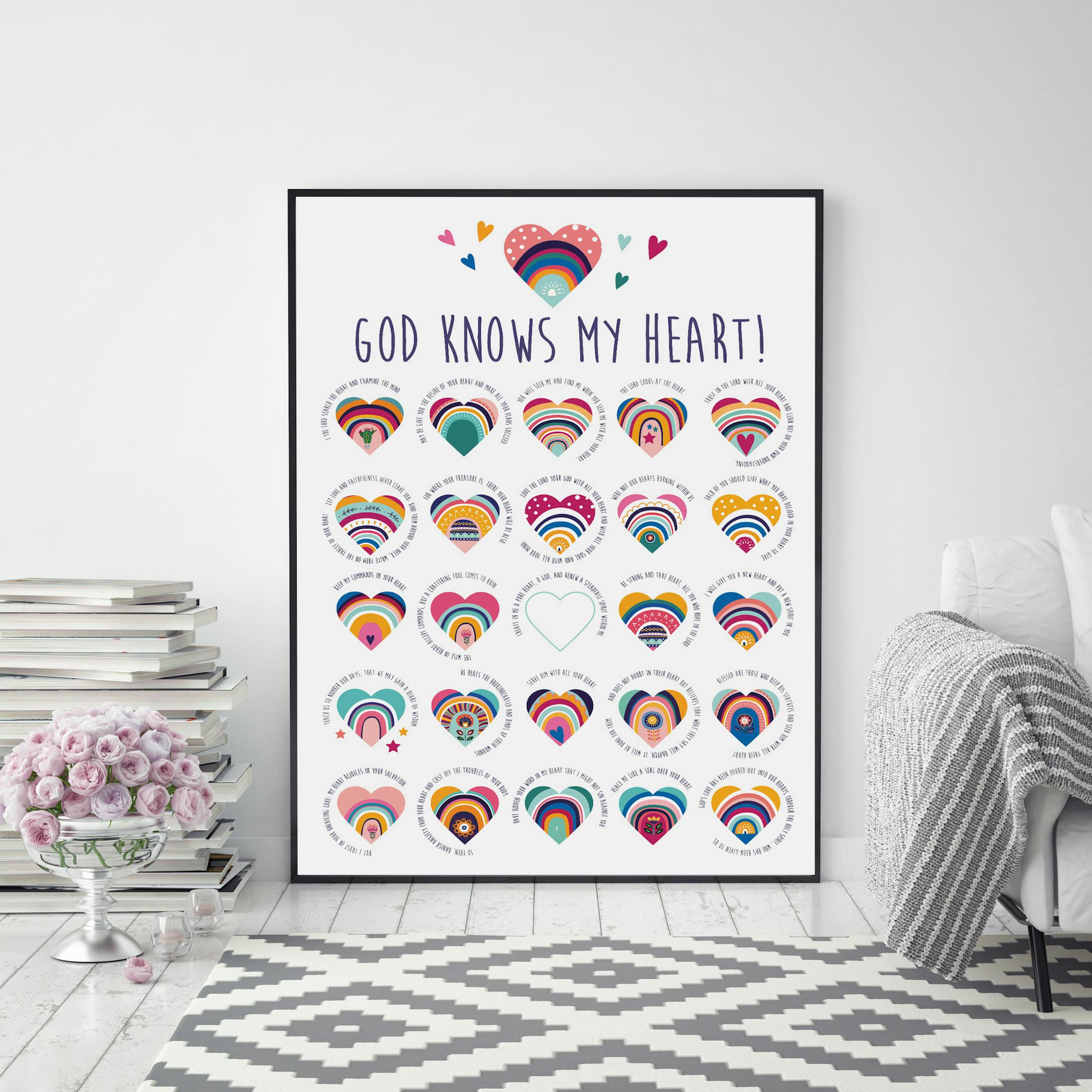 This beautiful, wall print features various fun hearts, each one surrounded by a beautiful scripture about our heart.