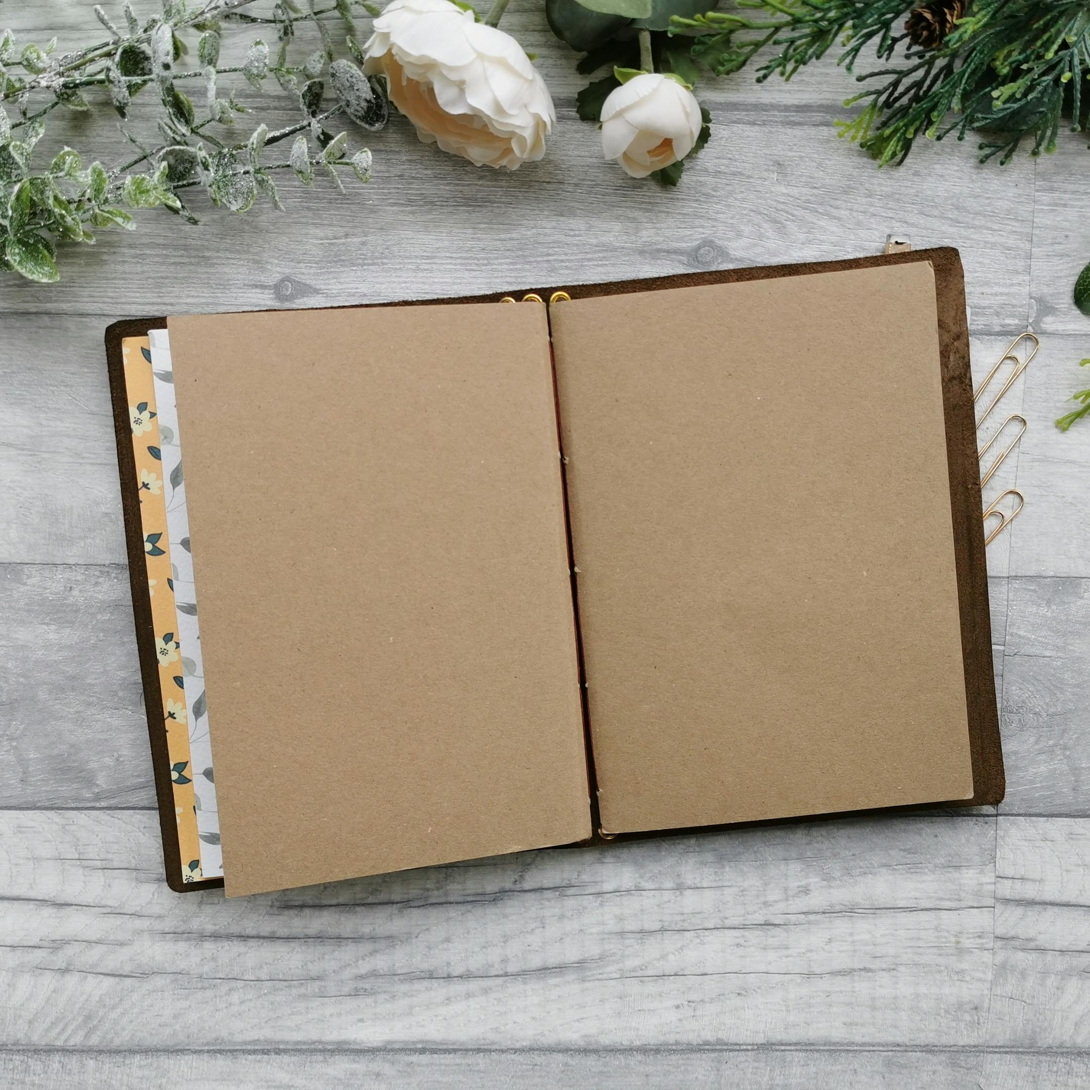 Perfect for keeping up to 4 A5 or smaller journals, each secured with an brown elastic fastening. Finished with brass coloured eyelets, to ensure longevity, and an elastic closure with leather edge protector.