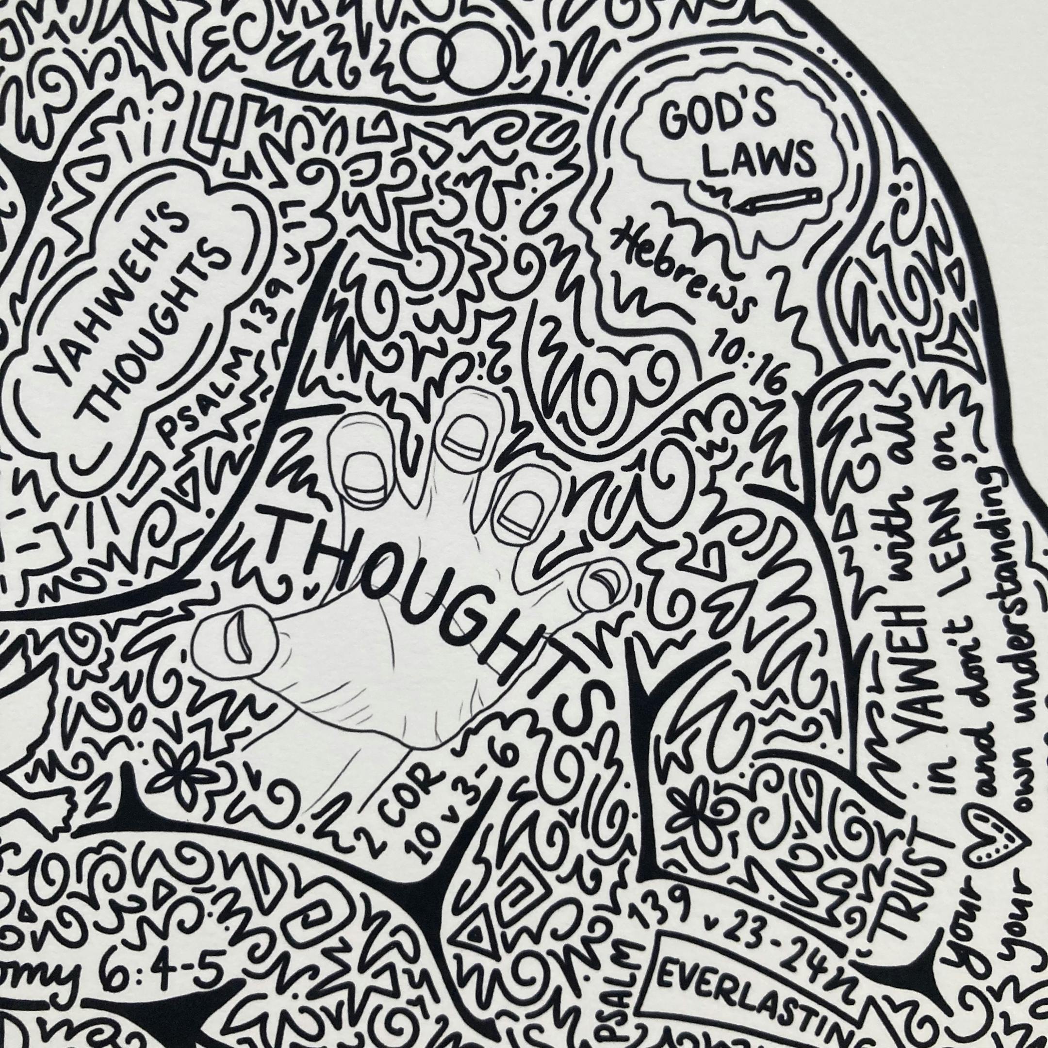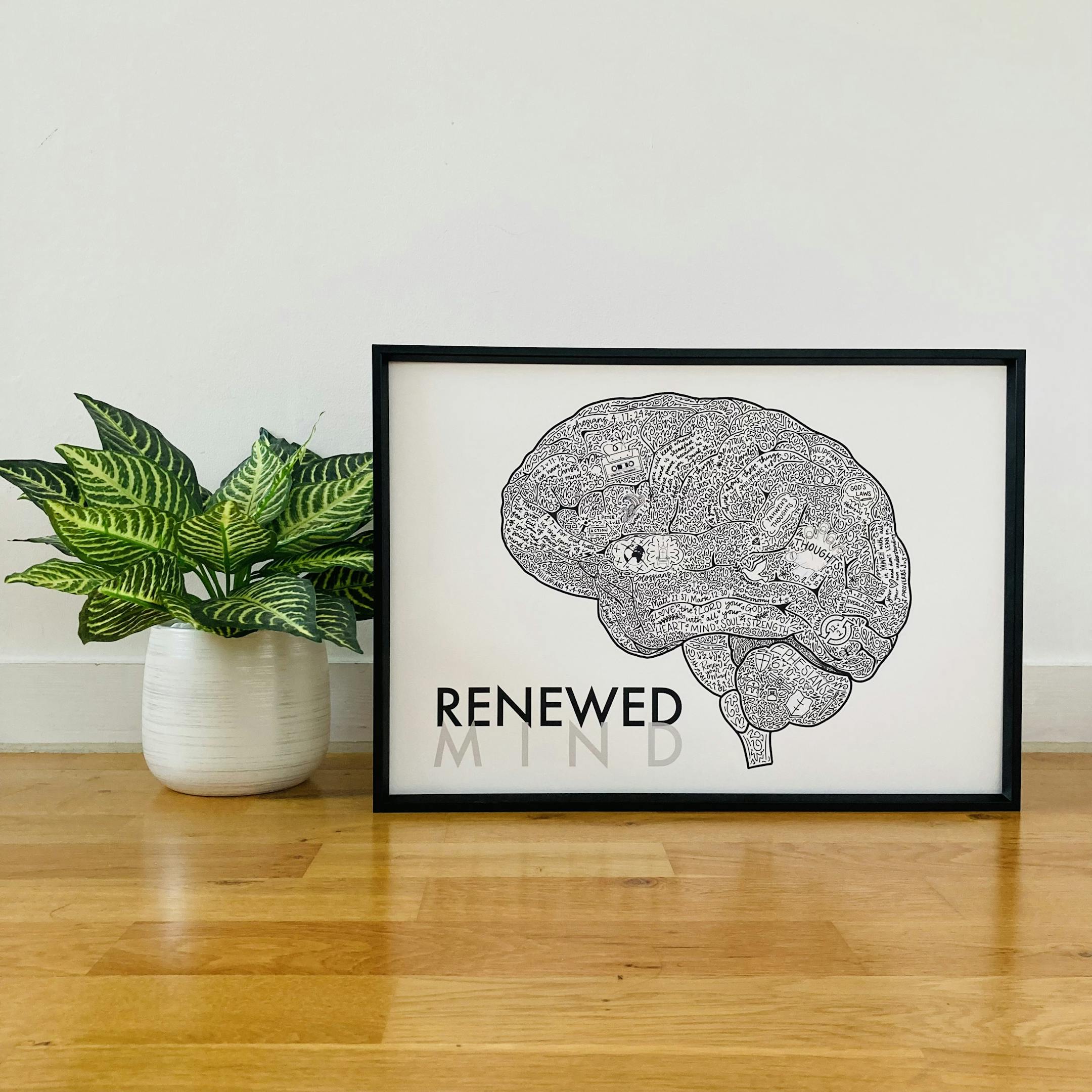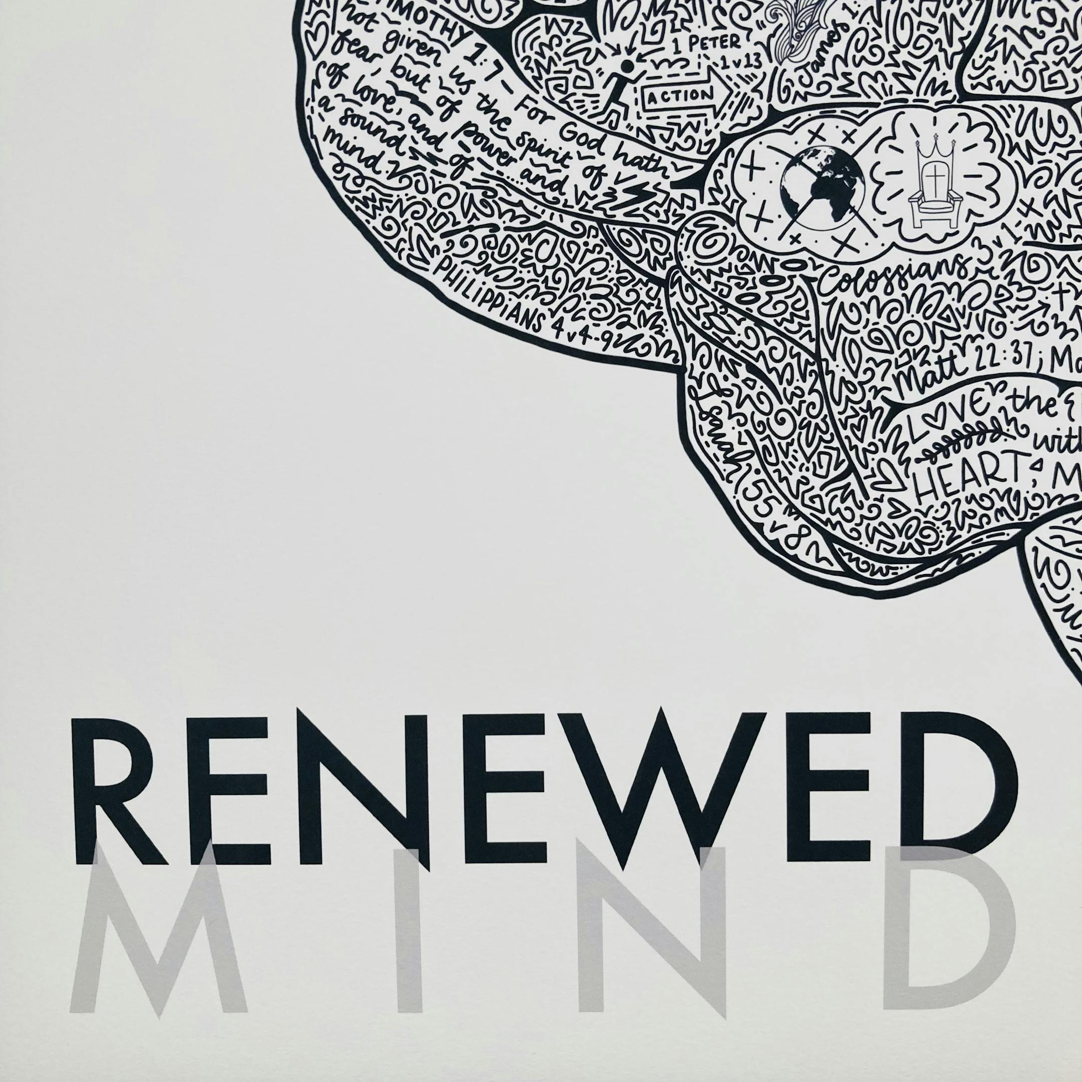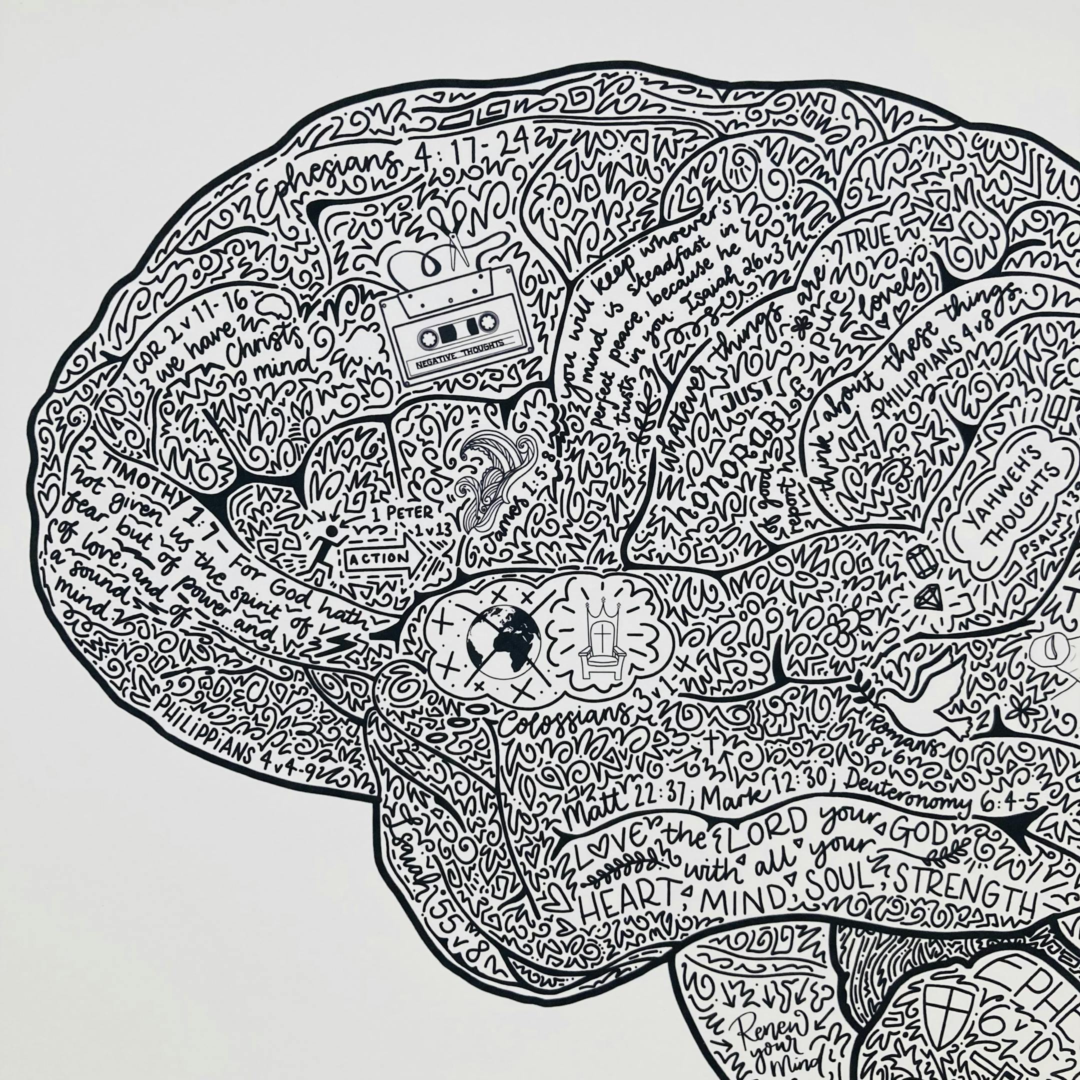 The design features a brain and the words ‘RENEWED MIND’ at the bottom left of the page. Meditate on the scriptures, references and illustrations among the doodles inside the brain, and be prompted to do so whenever you see this print on your wall.