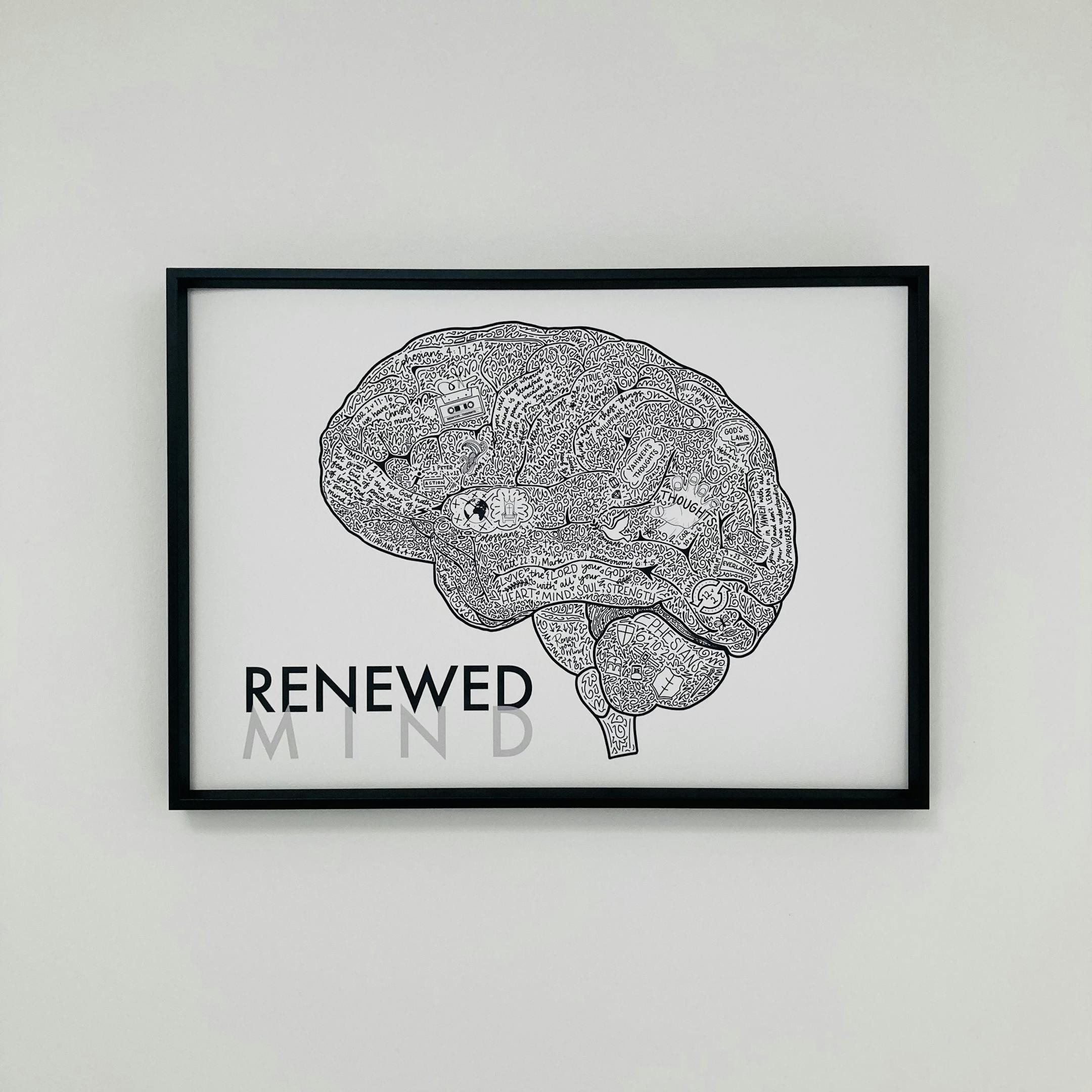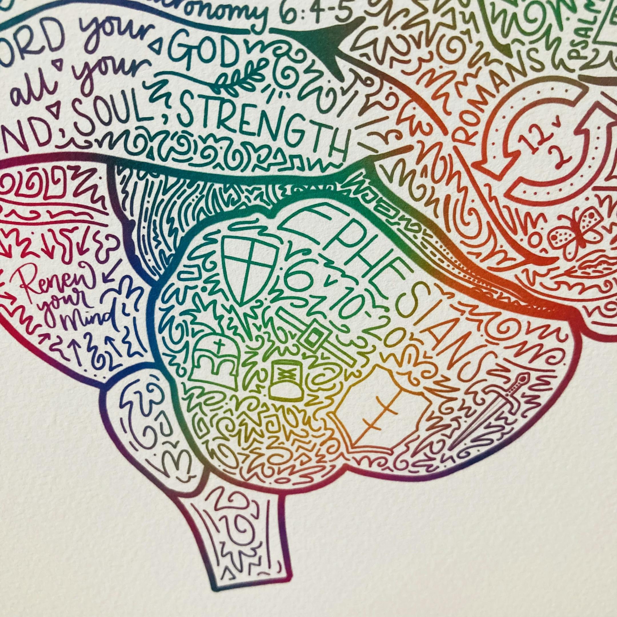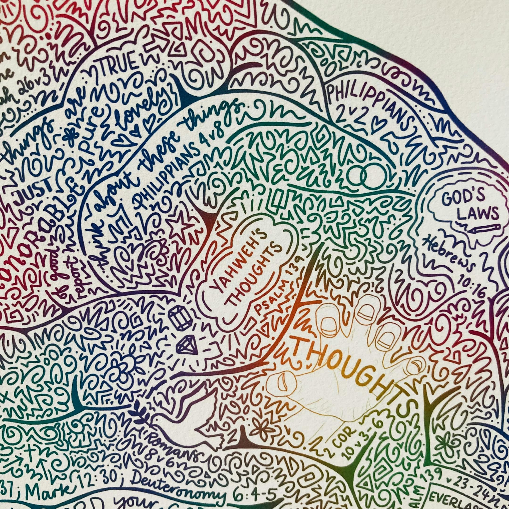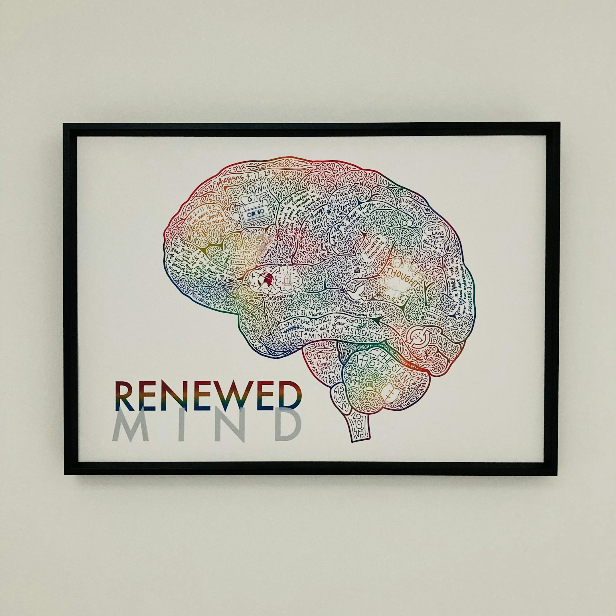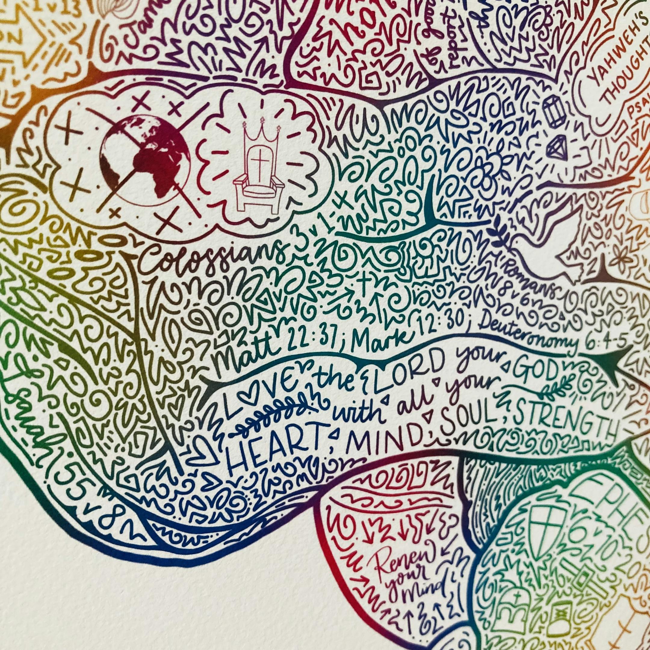 The design features a brain and the words ‘RENEWED MIND’ at the bottom left of the page. Meditate on the scriptures, references and illustrations among the doodles inside the brain, and be prompted to do so whenever you see this print on your wall.