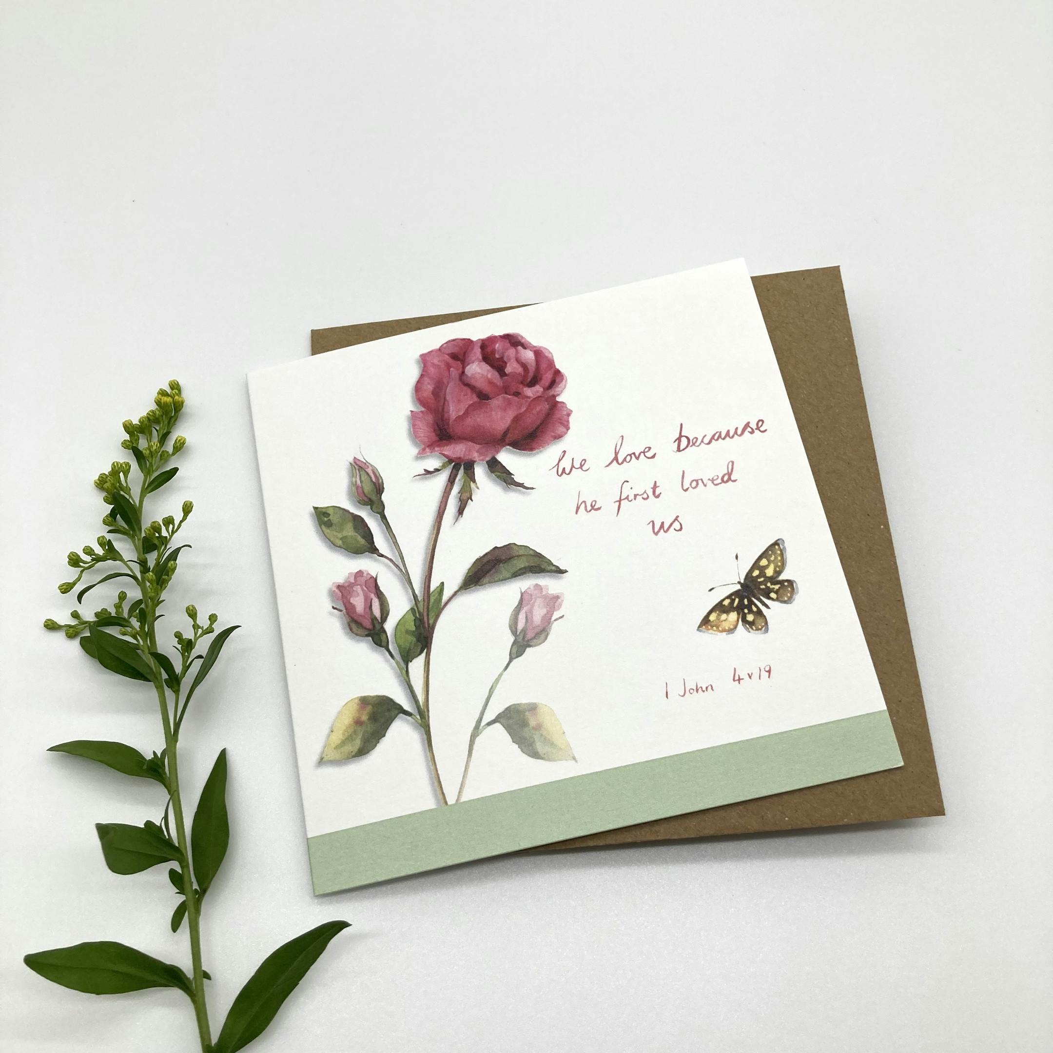 Rose is a beautiful floral blank card for any occasion. The verse on the front says "We love because he first loved us." 1 John 4:19