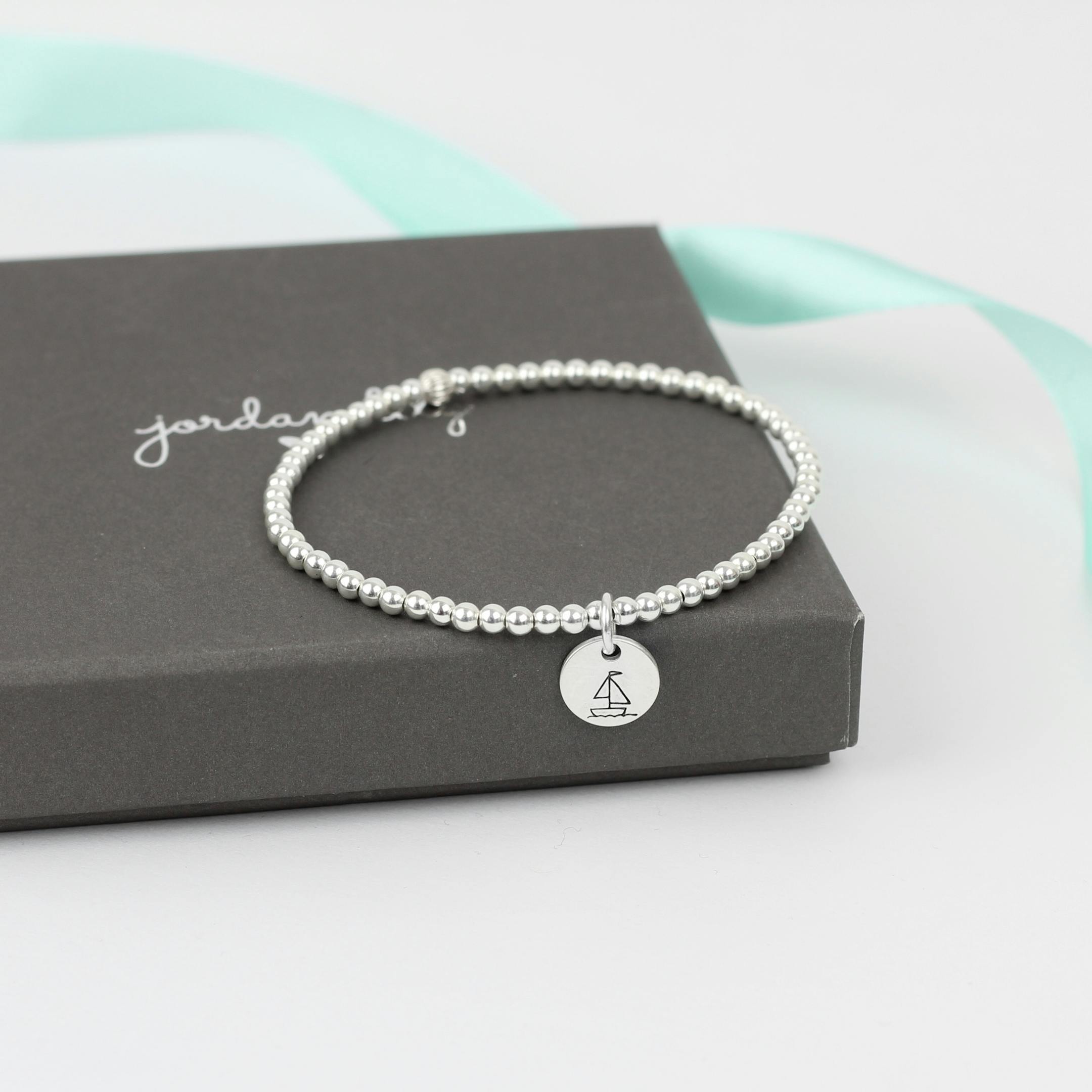 Handmade in my home workshop in Cornwall, these beautiful bead bracelets are made from solid sterling silver beads threaded onto strong elastic and finished with one of my hand-stamped Sailing Boat charms.