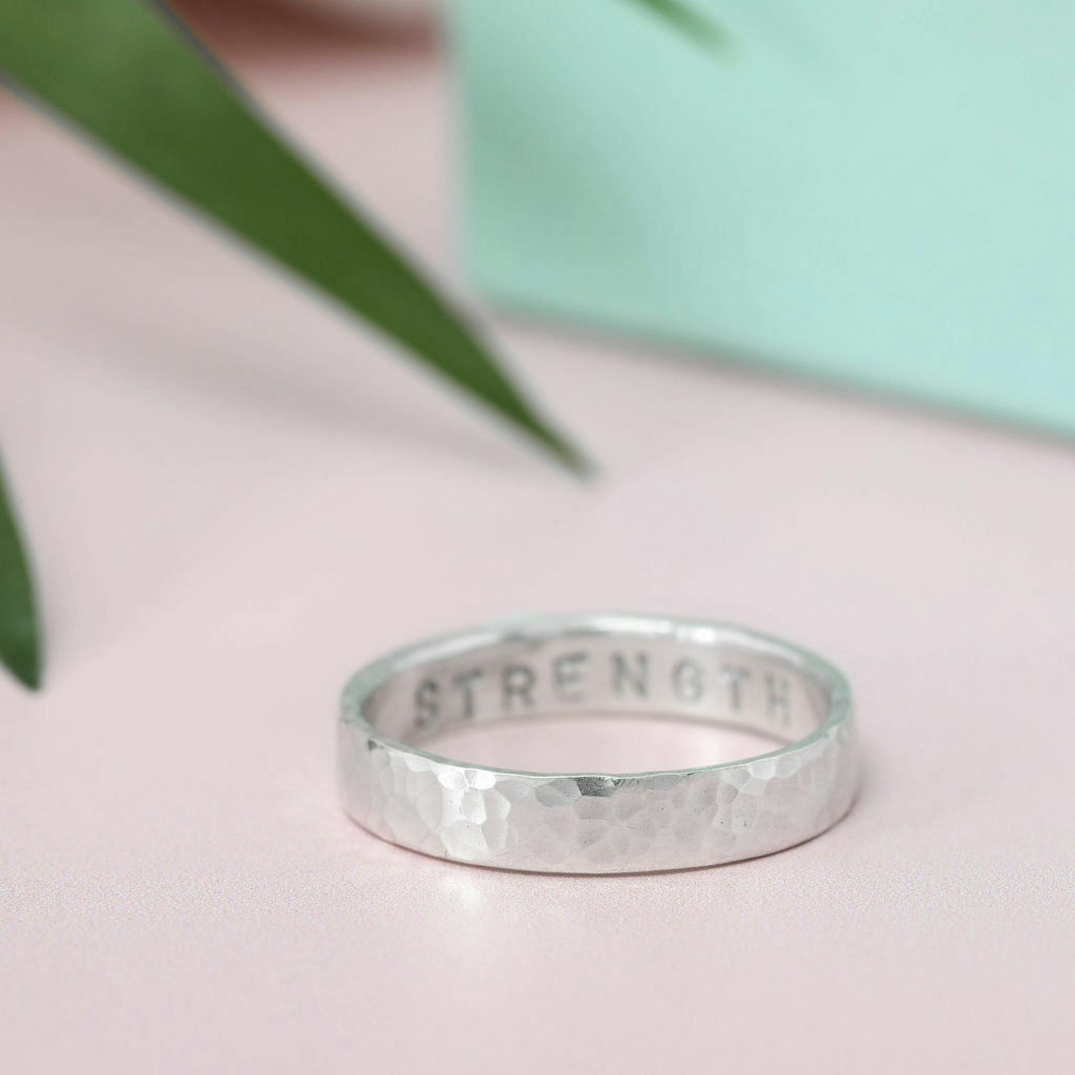 This delicate silver ring hides a secret… there’s a message stamped on the inside! Whether it’s something you want to say, celebrate or remember, choose your custom wording and I’ll add it to your secret message ring. On the outside, you can opt for a smooth finish or a beautiful hammered texture.