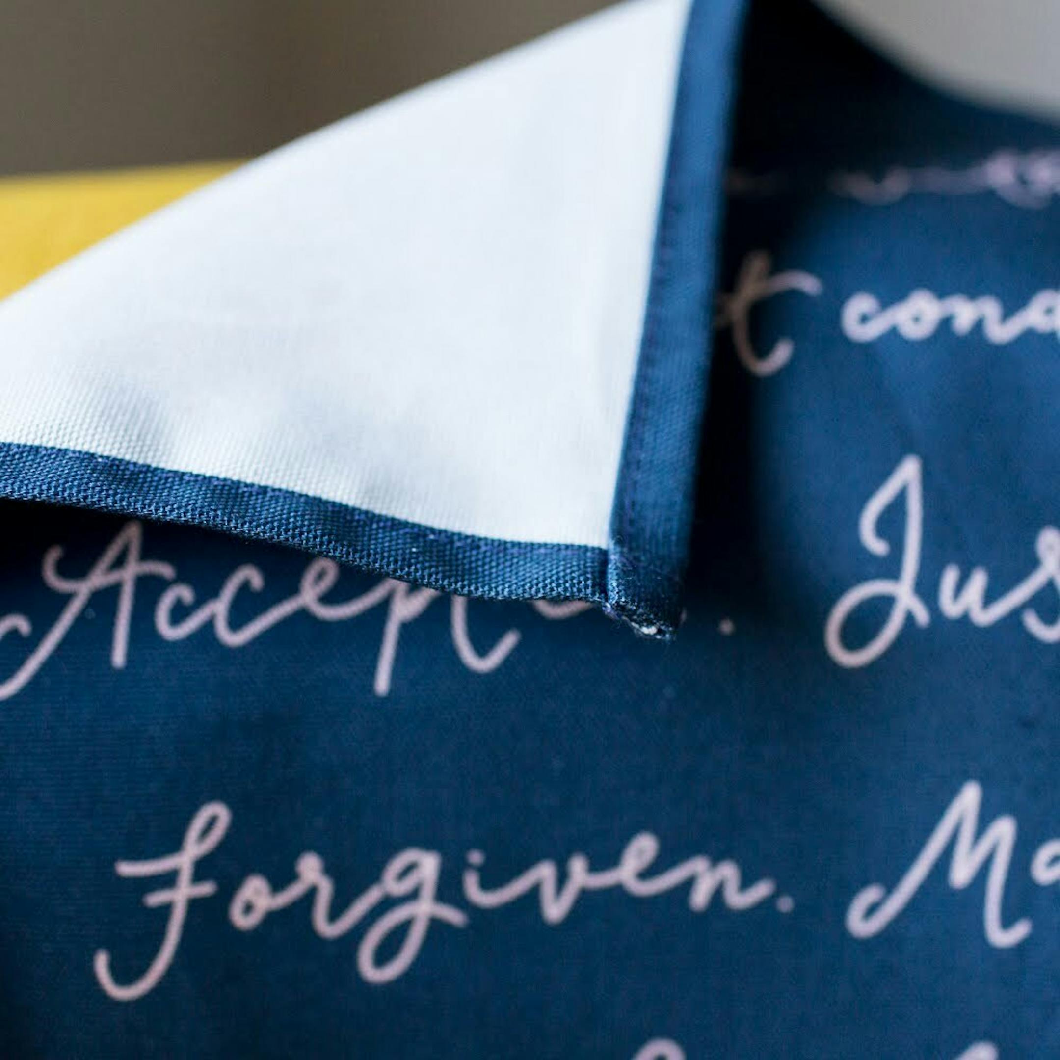 This set of two 100% cotton tea towels are printed with complimenting original hand lettered designs. The first is a deep blue tea towel with pink hand lettered truths of who we are in Christ. The second is swapped - a blush pink tea towel with blue hand lettered names of Jesus.