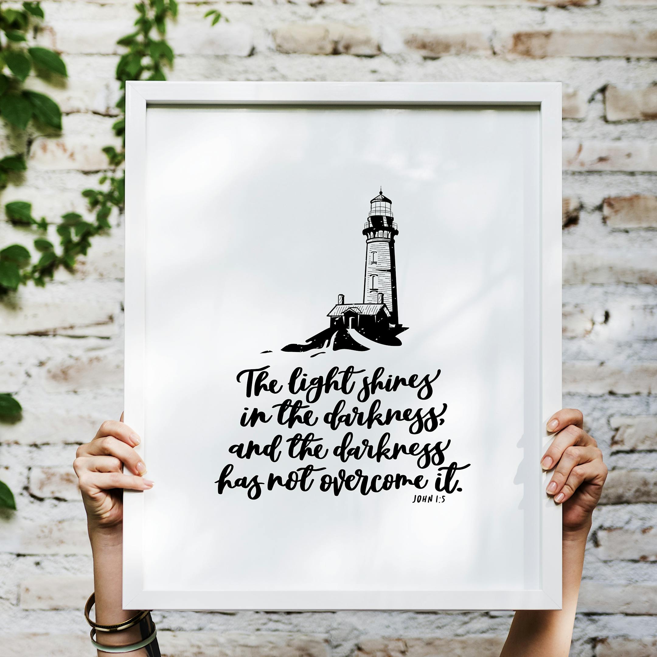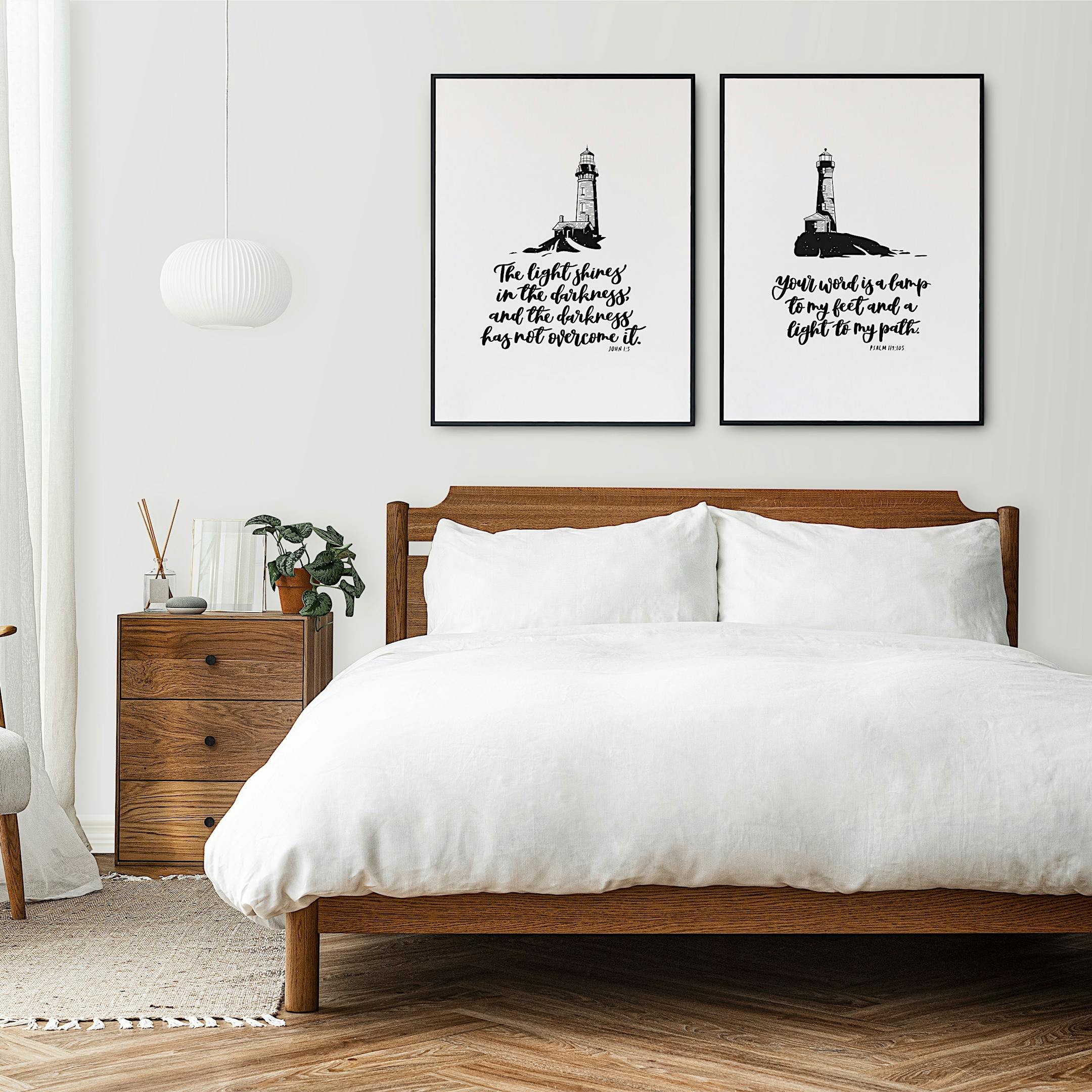 This inspirational print set features two physical, high quality art prints. The prints feature eye-catching lighthouse illustrations and hand-written bible verses. The powerful bible verses included in this print set are from Psalm 119:105 "Your word is a lamp to my feet and a light to my path" and John 1:5 "The light shines in the darkness, and the darkness has not overcome it".