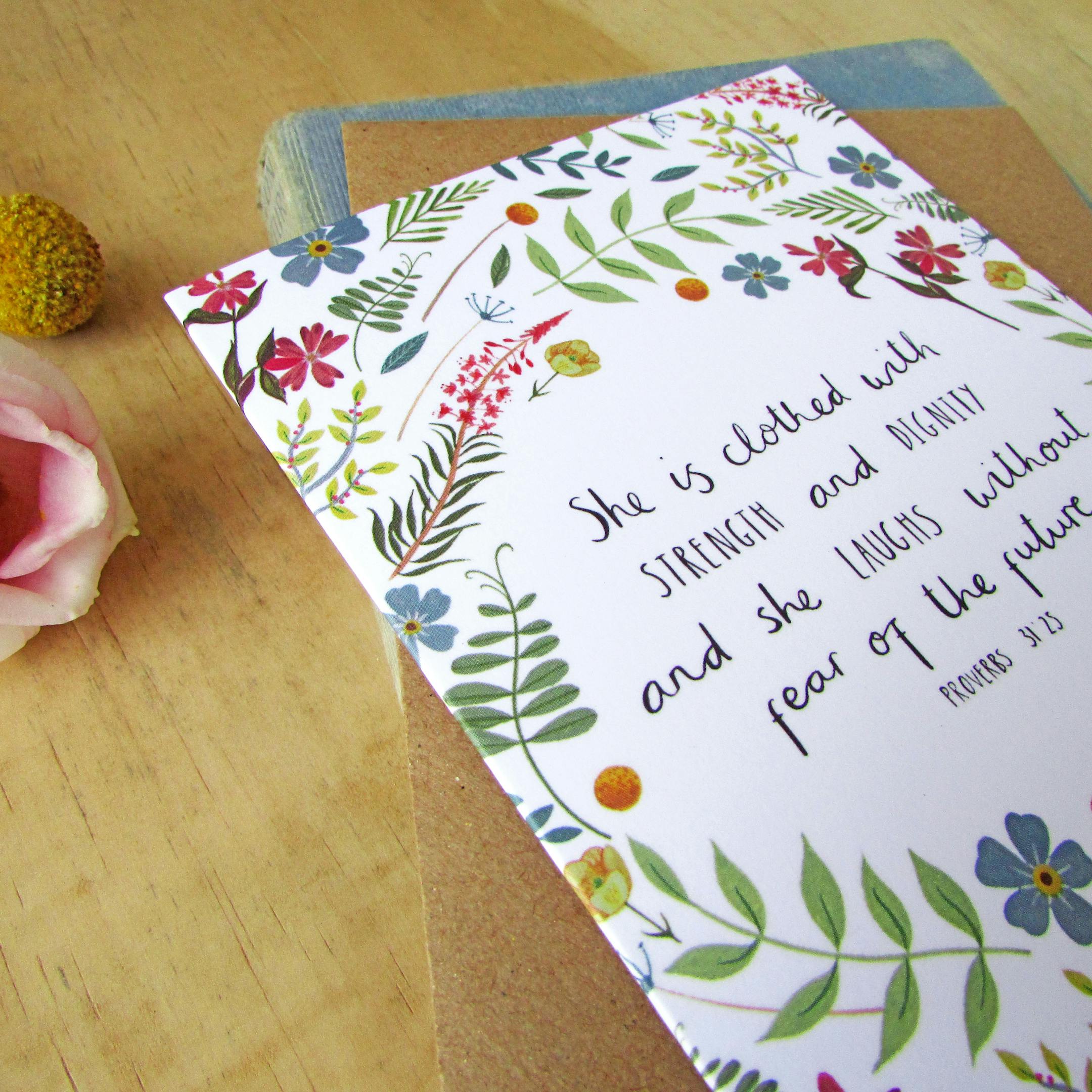 A beautifully illustrated greetings card featuring the Proverbs 31:25 message. The perfect card to thank and encourage the wonderful women in our lives!