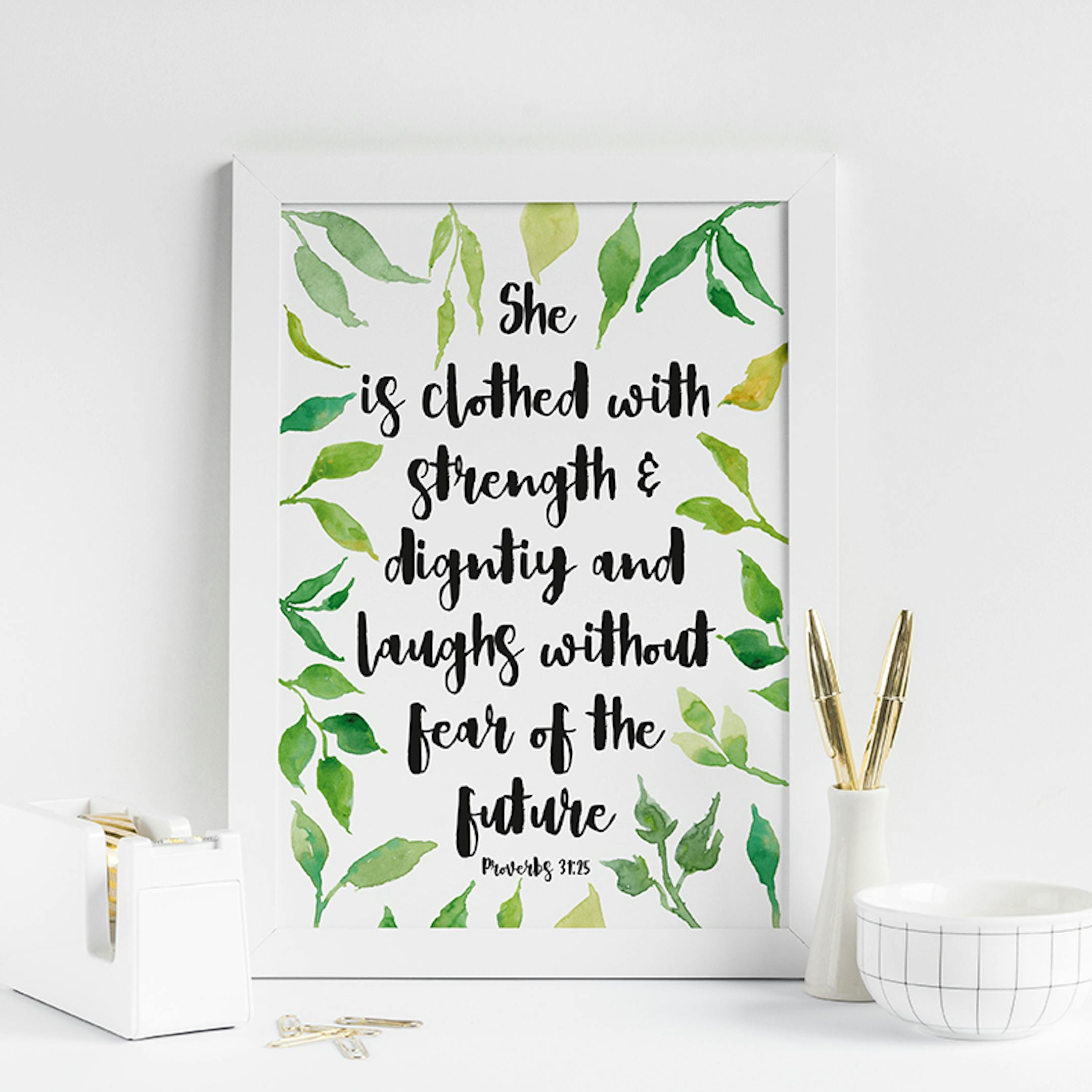 This wonderful calligraphy digital print features watercolour leaves & words from Proverbs 31:25 which is the perfect reminder to add to your house or gift too!