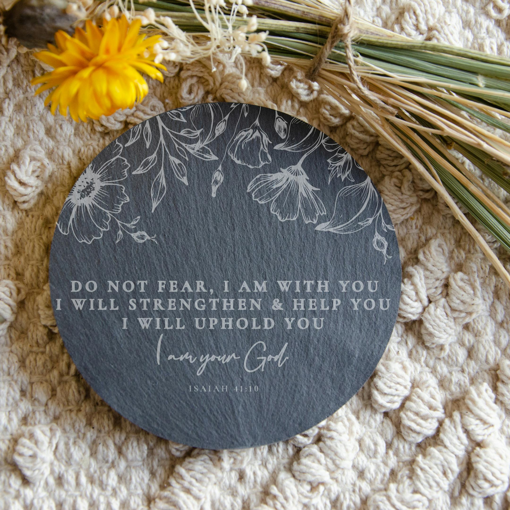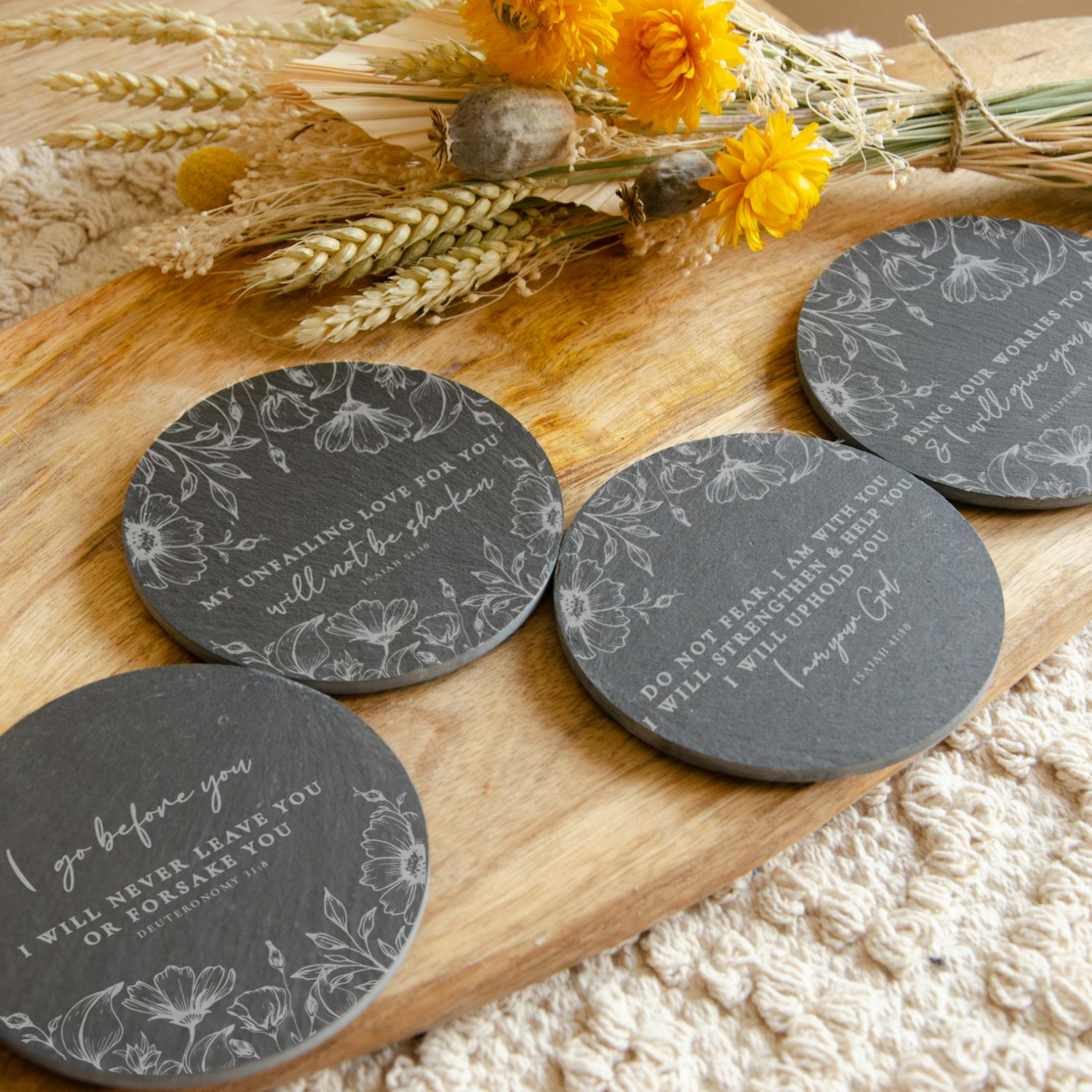 Add a unique and special element to your home with our Gods Promise of love coaster set. Included in this set if 4 engraved slate coasters with floral details.
