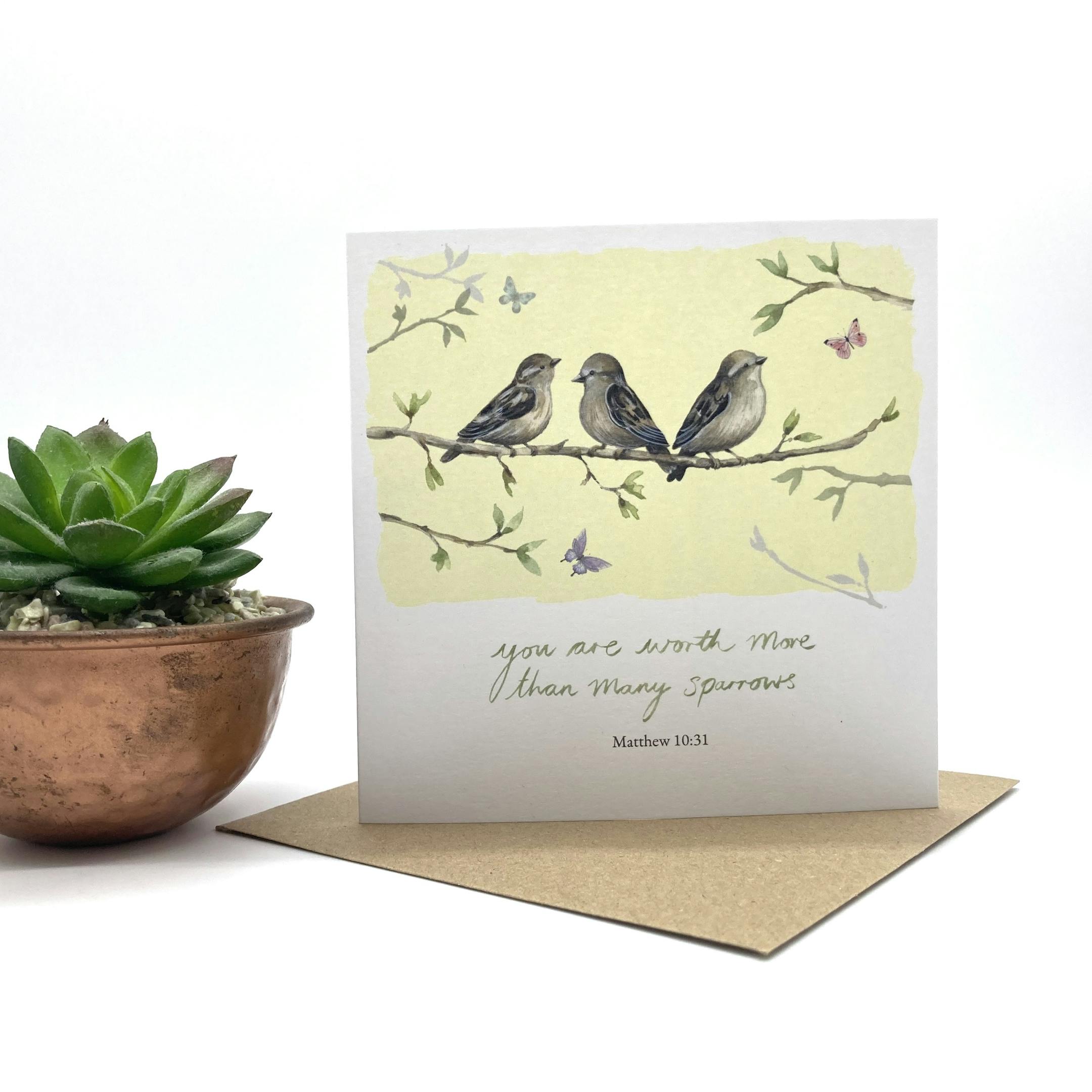 Sparrows is one of 12 blank notecards in our "Look at the Birds" collection inspired from the scripture in Matthew 6.