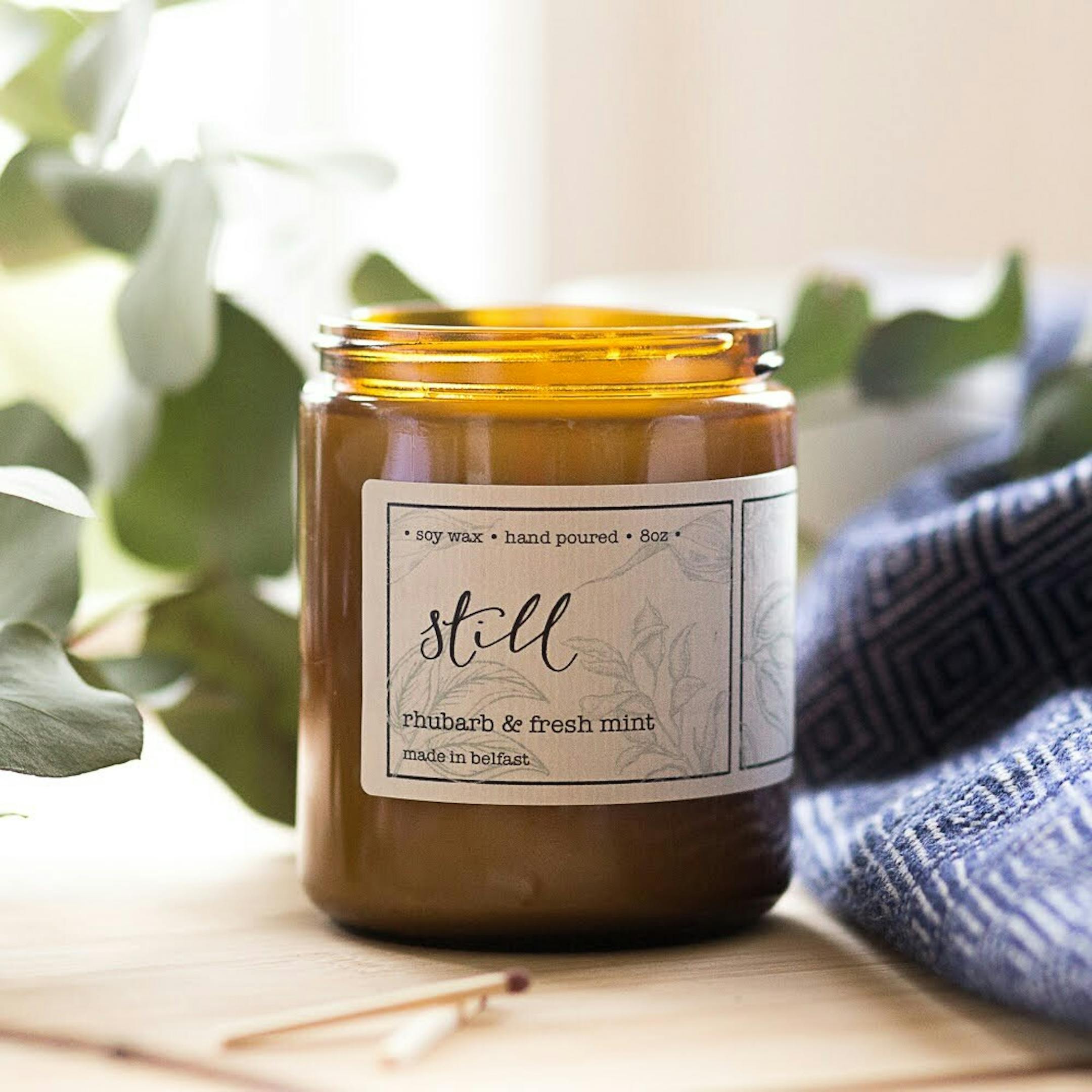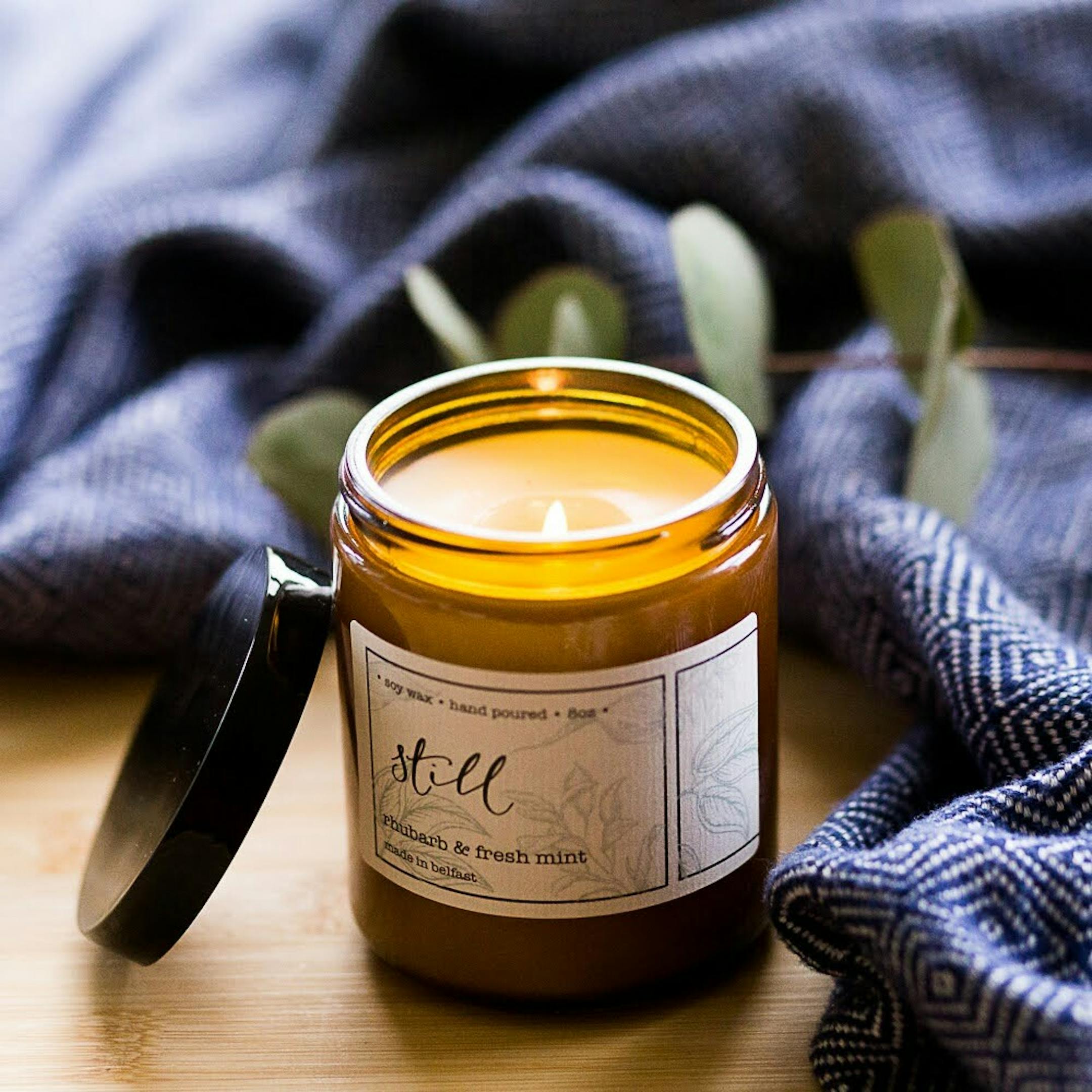 Still is a soy wax candle scented with rhubarb & mint. Hand poured in an amber glass jar, a candle to help you to “Be still, O soul & know that I am God”.