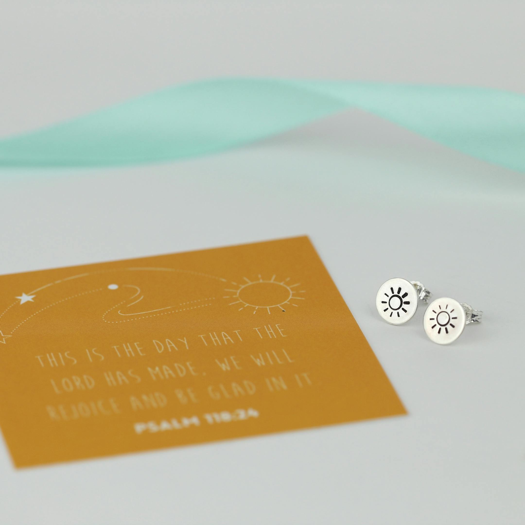 These lightweight 8mm sterling silver sun studs are dainty and cute! Inspired by Psalm 118:24, they include an accompanying verse card.