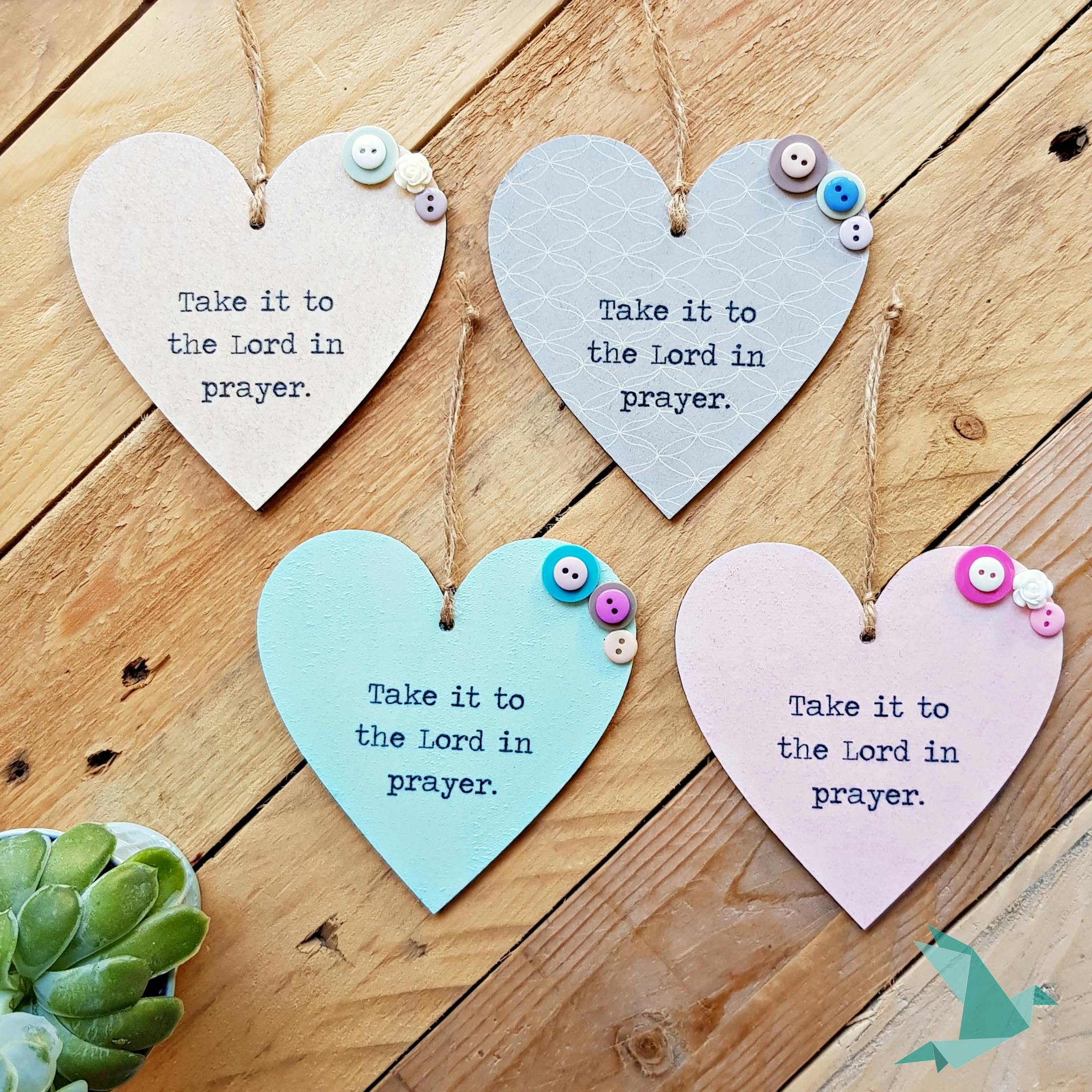 Individually handcrafted wooden hearts with printed scripture or inspirational and uplifting words.