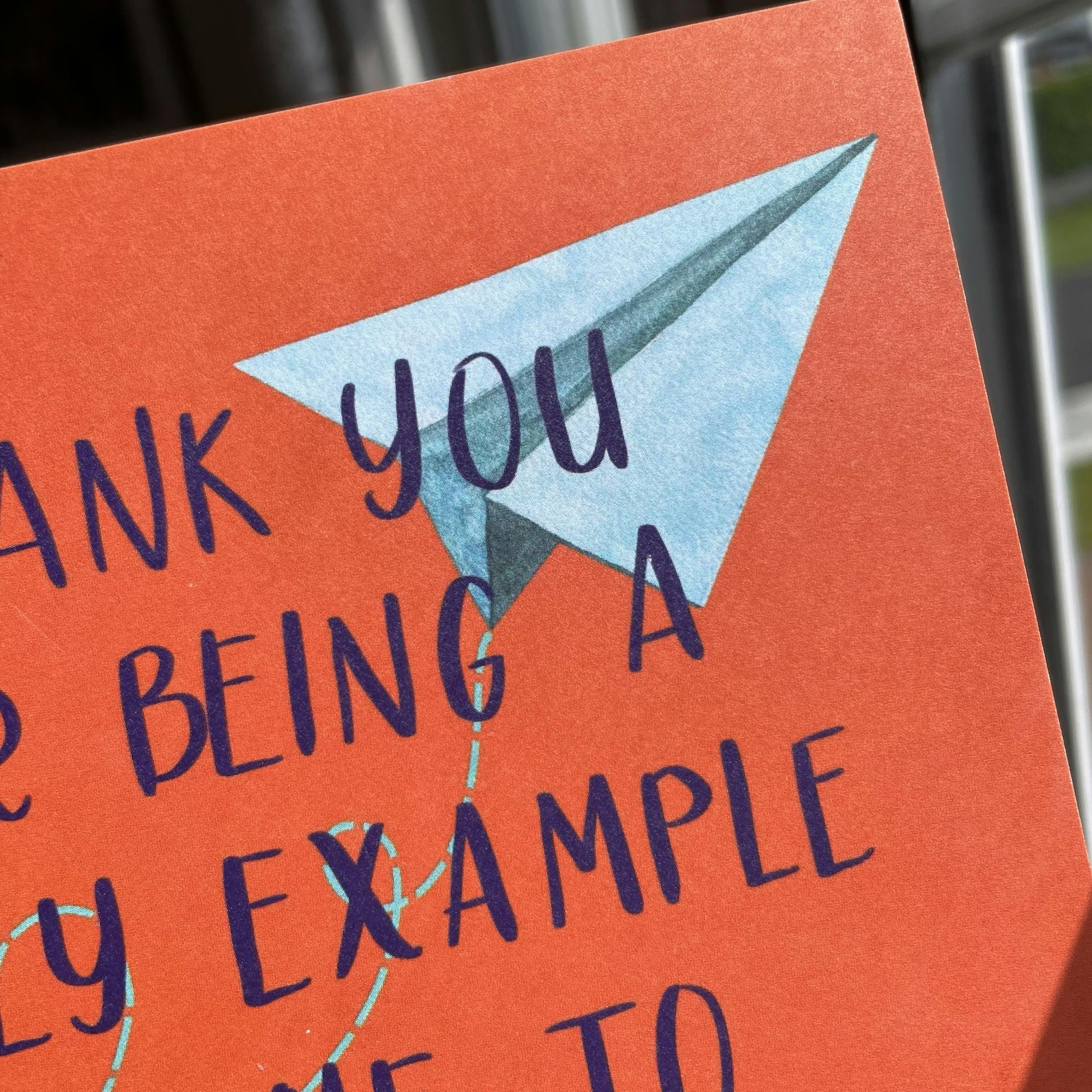 Features a cute paper aeroplane illustration with a heart shaped trail, on a bright orange background. Suitable to give to a man or woman, perfect for a parent, grandparent, godparent, Sunday school teacher, pastor or mentor. Also makes a great Mother’s Day card or Father’s Day card for a godly mum or dad.
