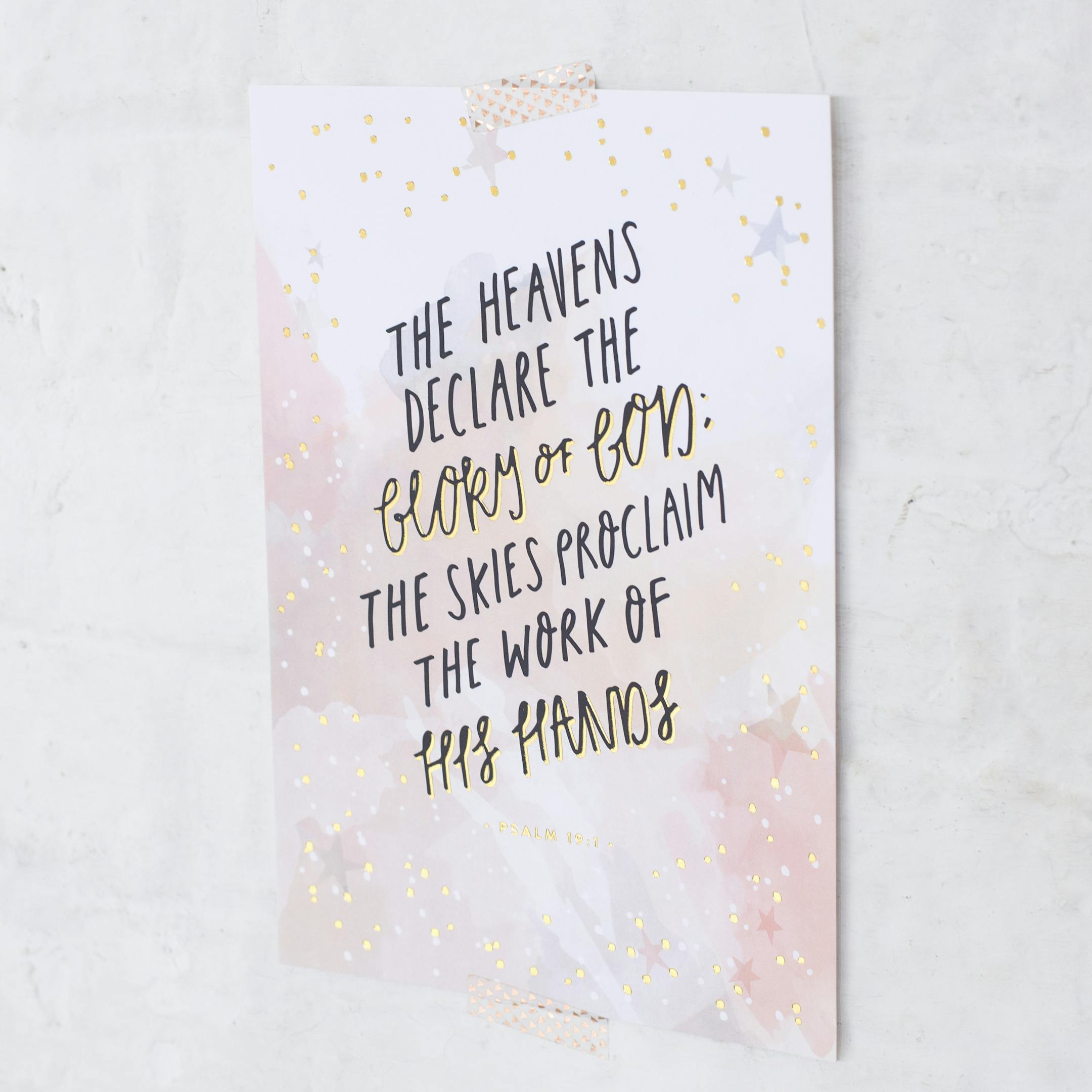 Part of the Creation Collection, the verse reads: "The heavens declare the glory of God; the skies proclaim the work of his hands.” Psalm 19:1