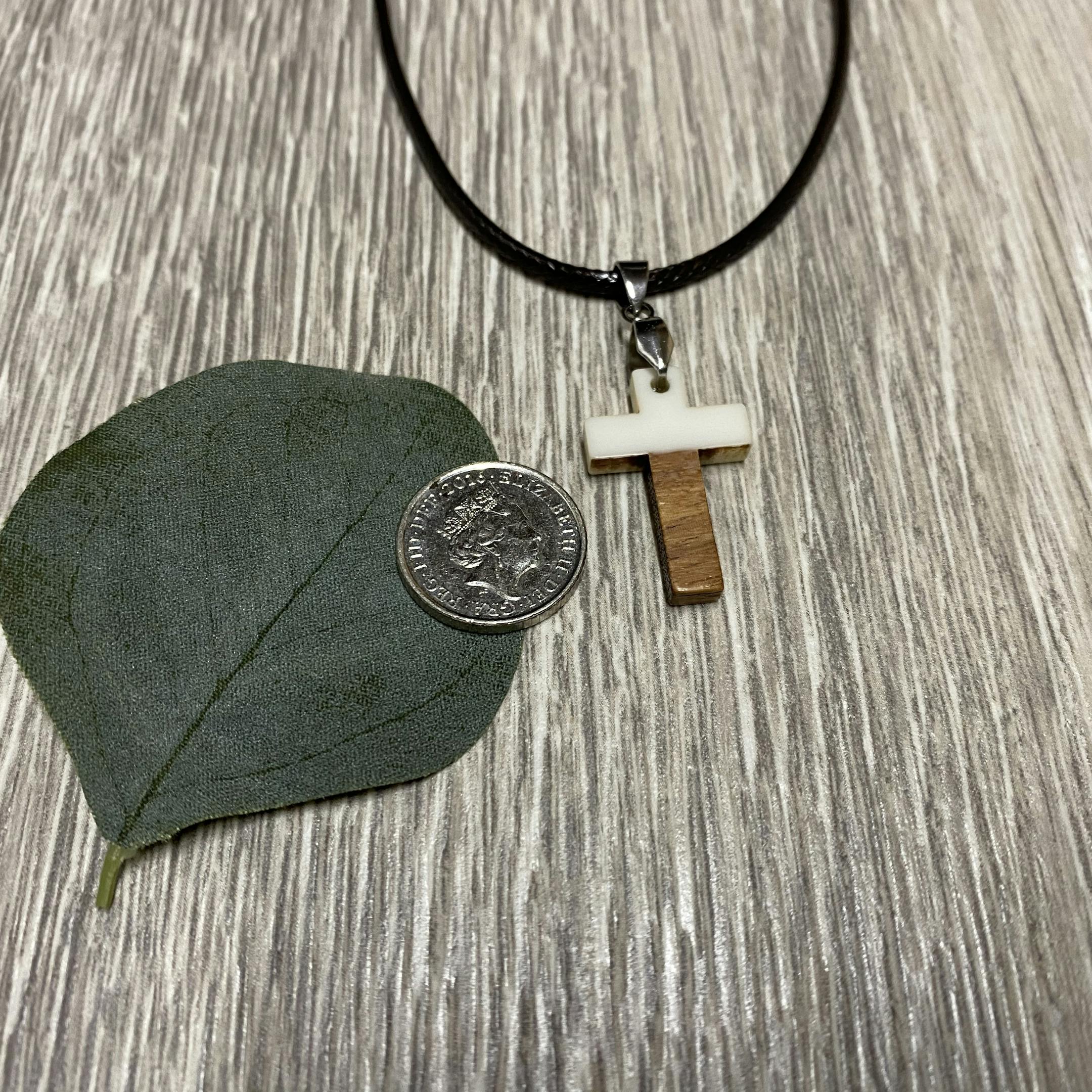 This letterbox gift contains a resin and wood cross necklace - the pendant is 3 cm in length