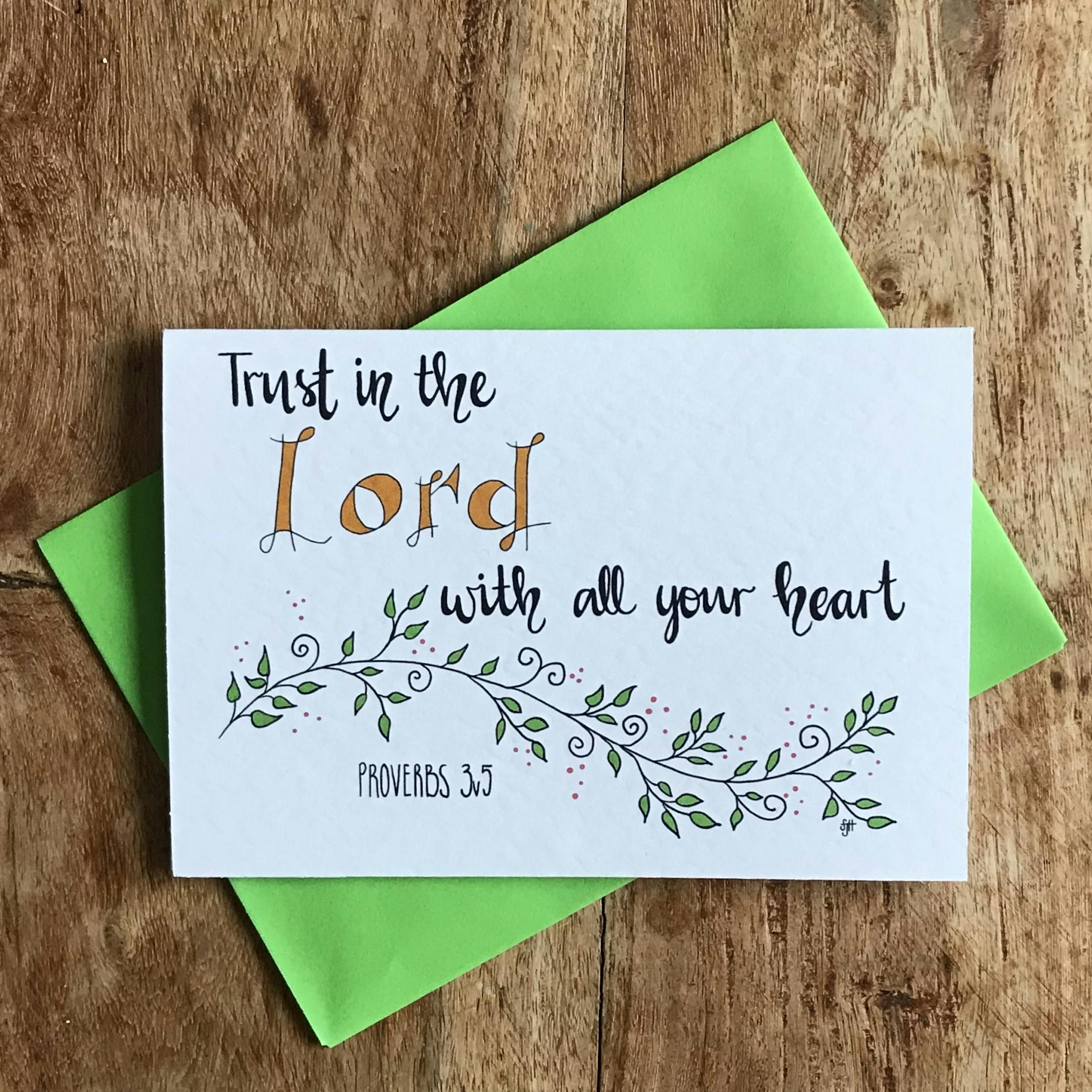 Trust in the Lord with all your heart, Proverbs 3:5. Hand lettered A6 greetings card.