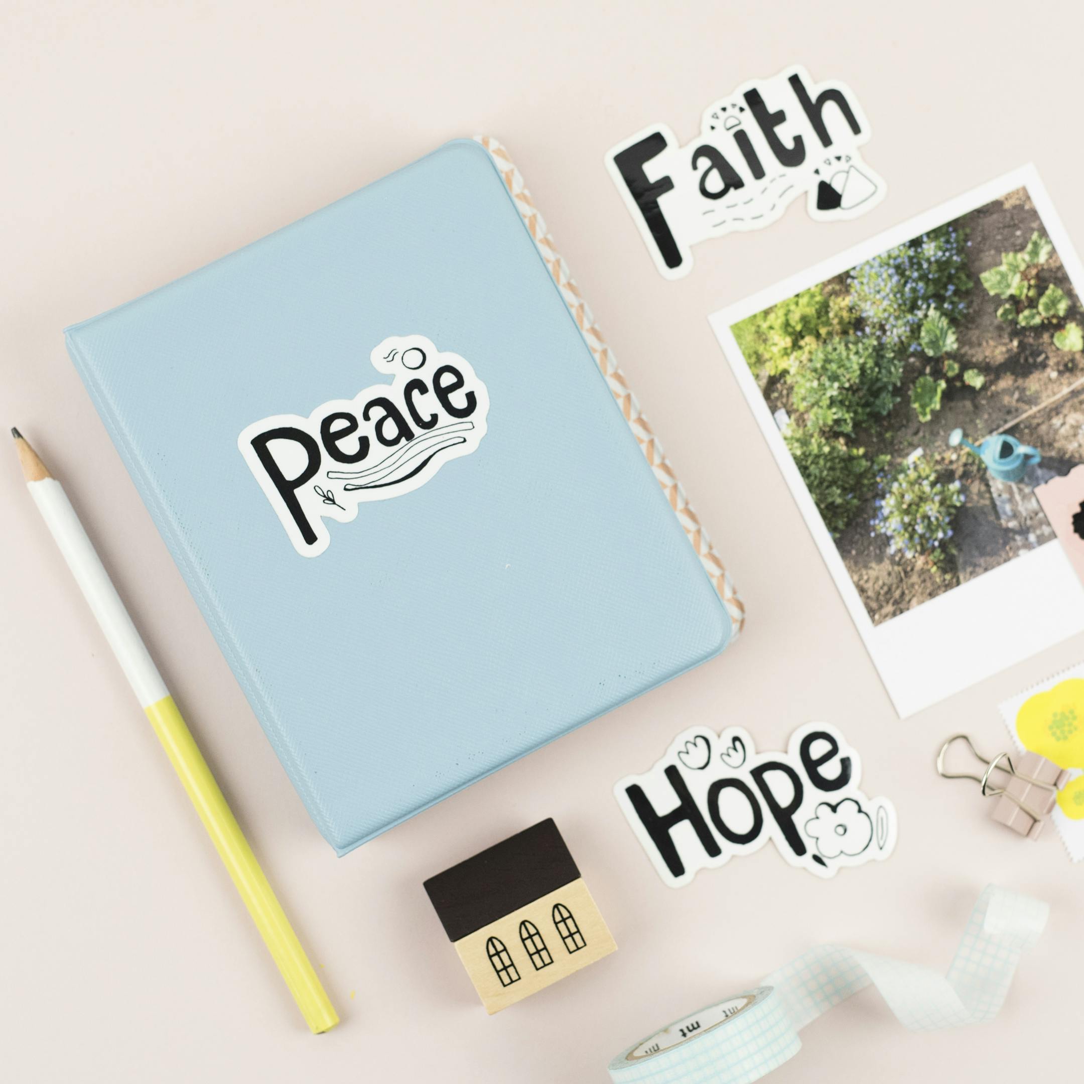 A set of 3 vinyl stickers - featuring a hand lettered design and the words; Faith, Hope & Peace Perfect as a motivational gift for a friend or yourself!