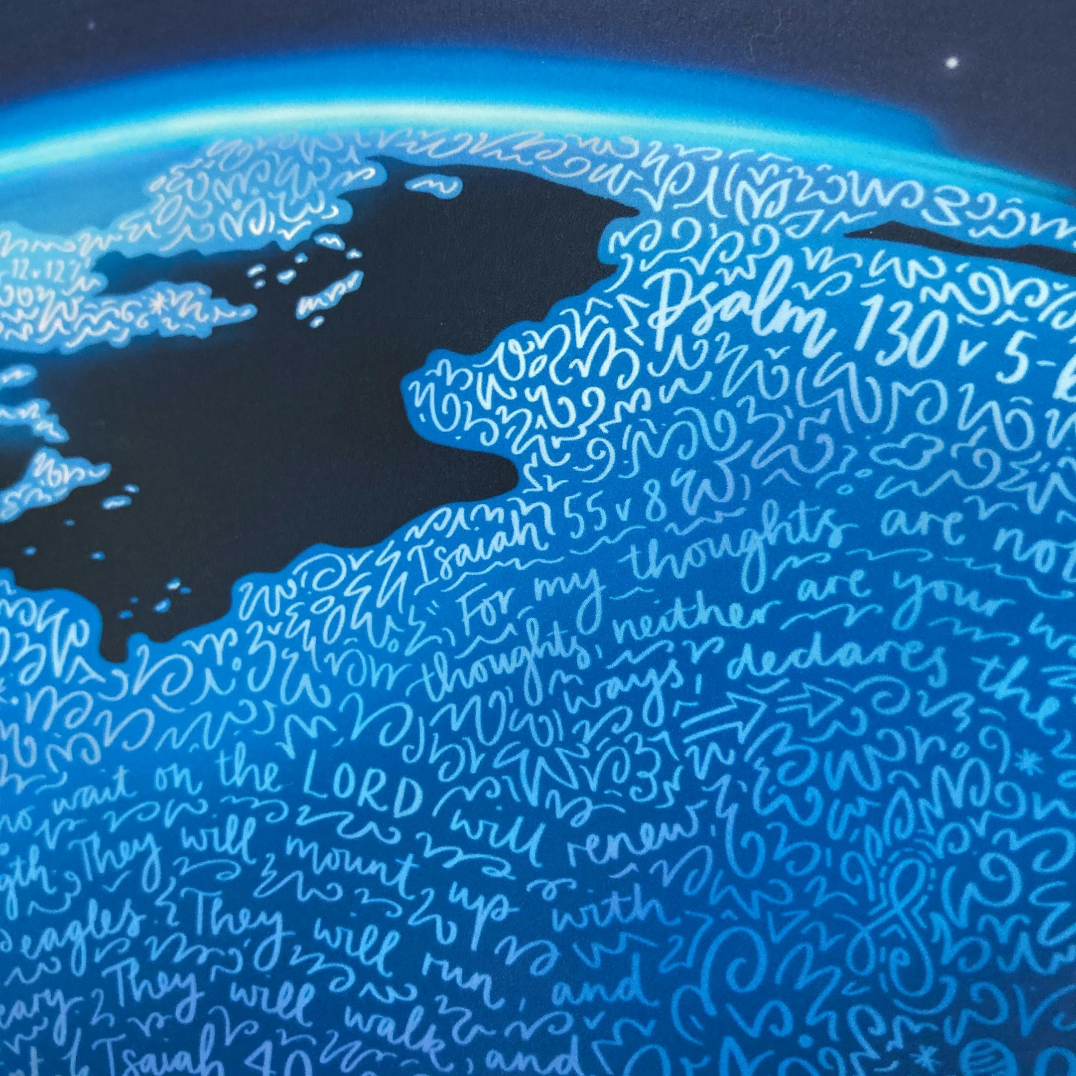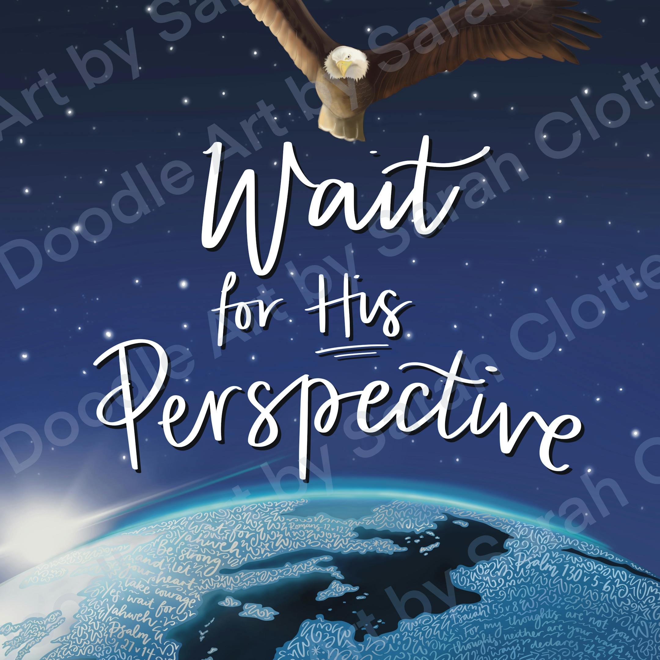 Using the imagery of this Bible passage, the print features an eagle soaring high above the earth from space with the sun appearing in the distance. Scripture references and verses relating to waiting on God are doodled inside the land on the earth’s surface.