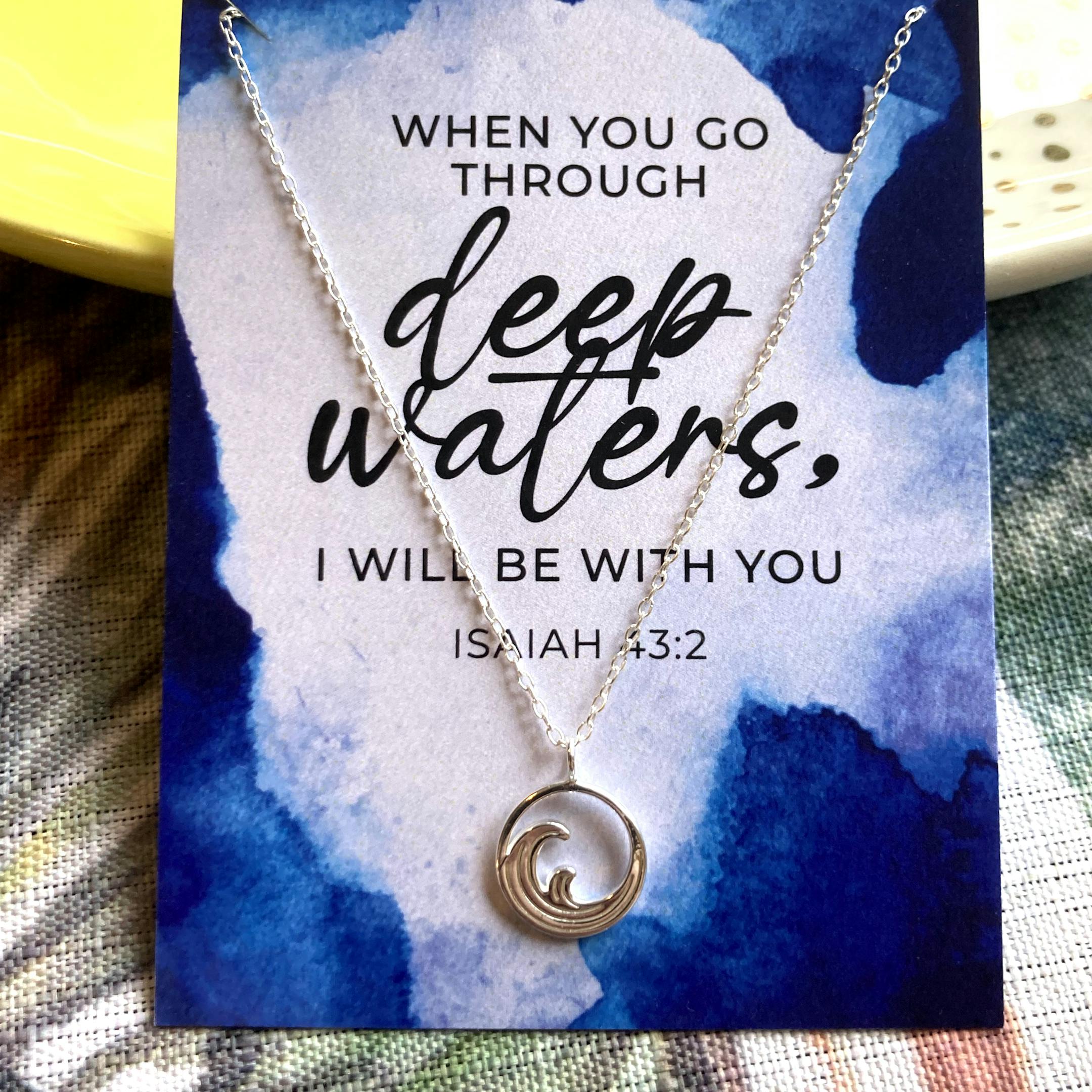 This pretty sterling silver wave pendant and necklace (stamped 925) comes on a beautifully designed card featuring the verse 'When you go through deep waters I will be with you' Isaiah 43:2.