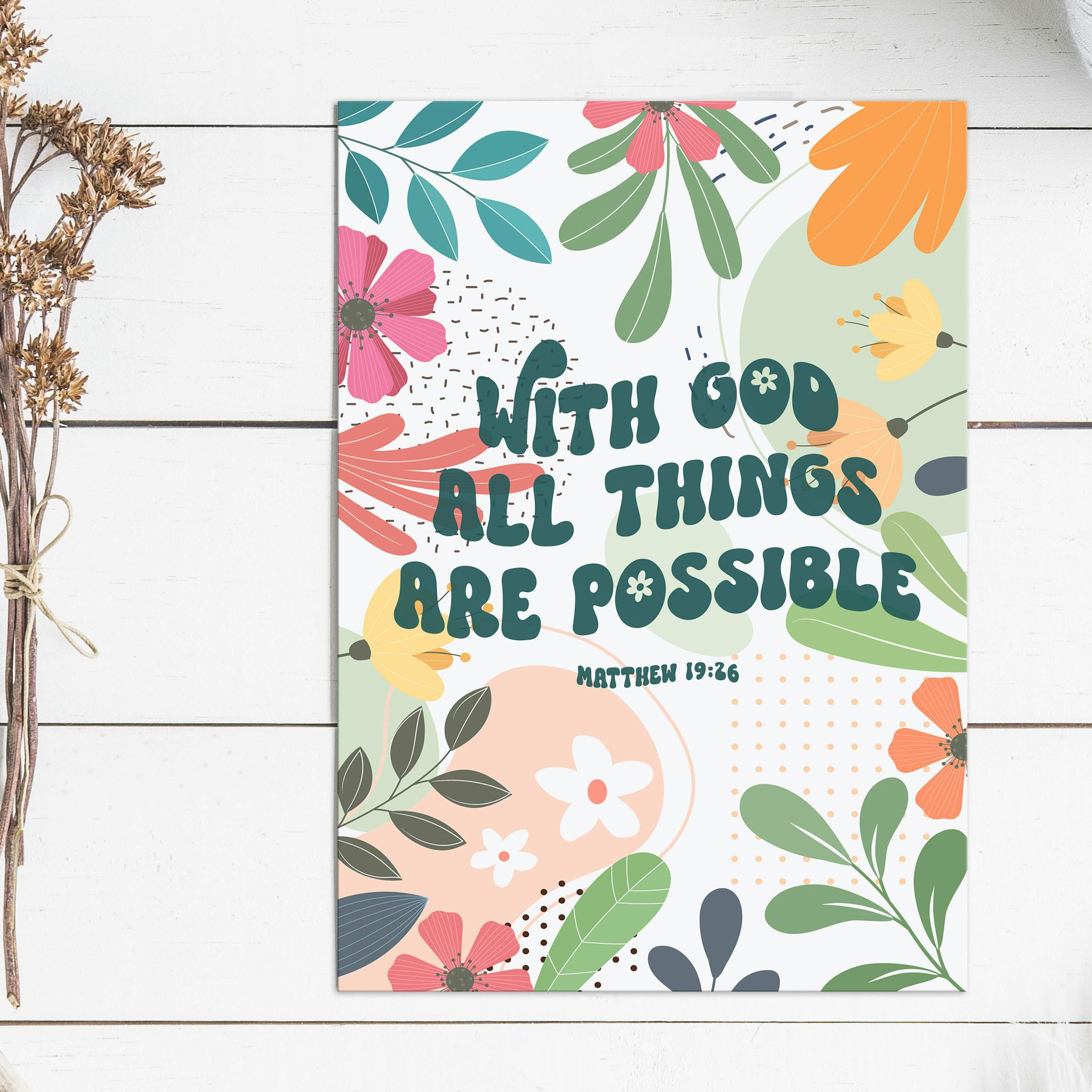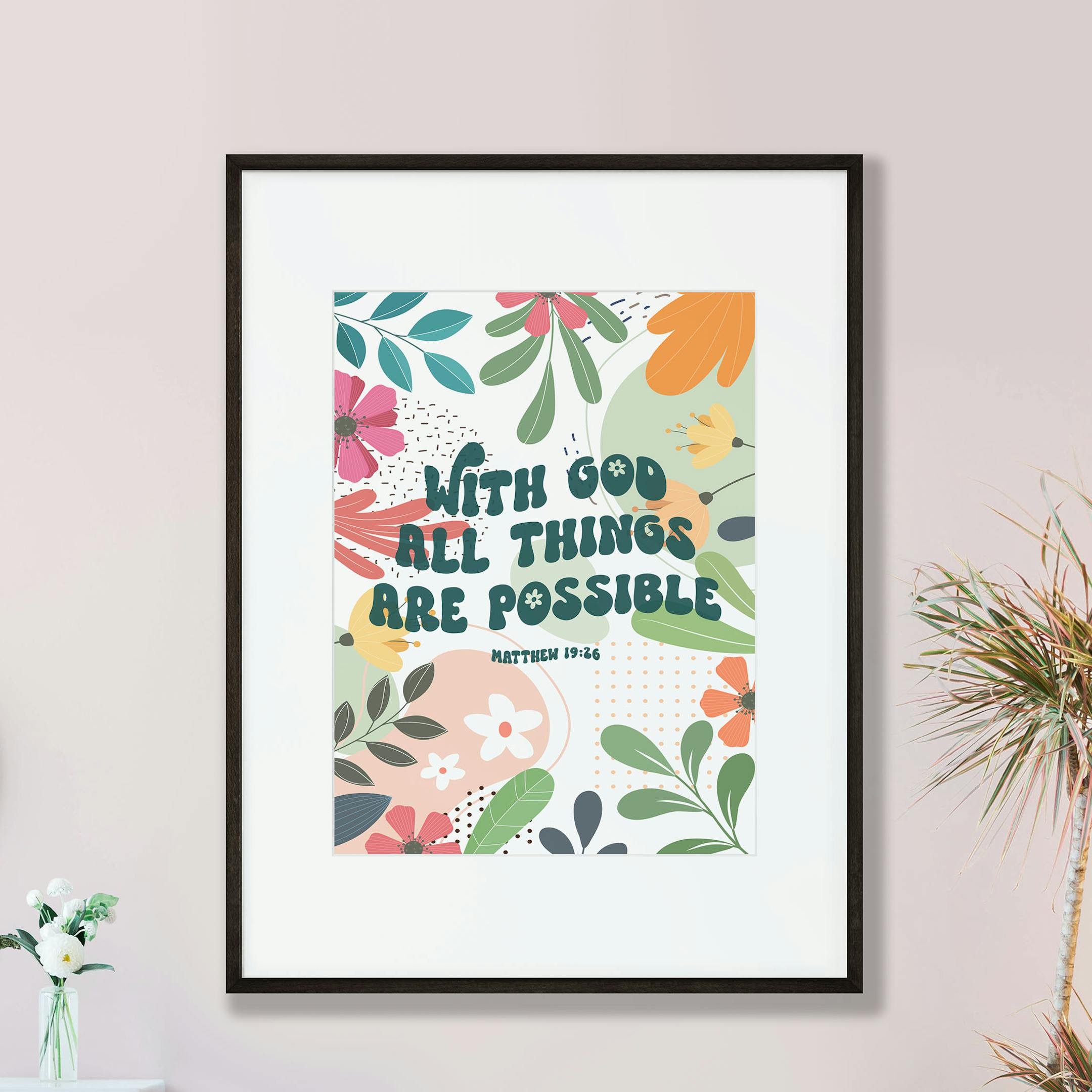 With God All Things Are Possible Retro Floral Christian Art Print - Matthew 19:26