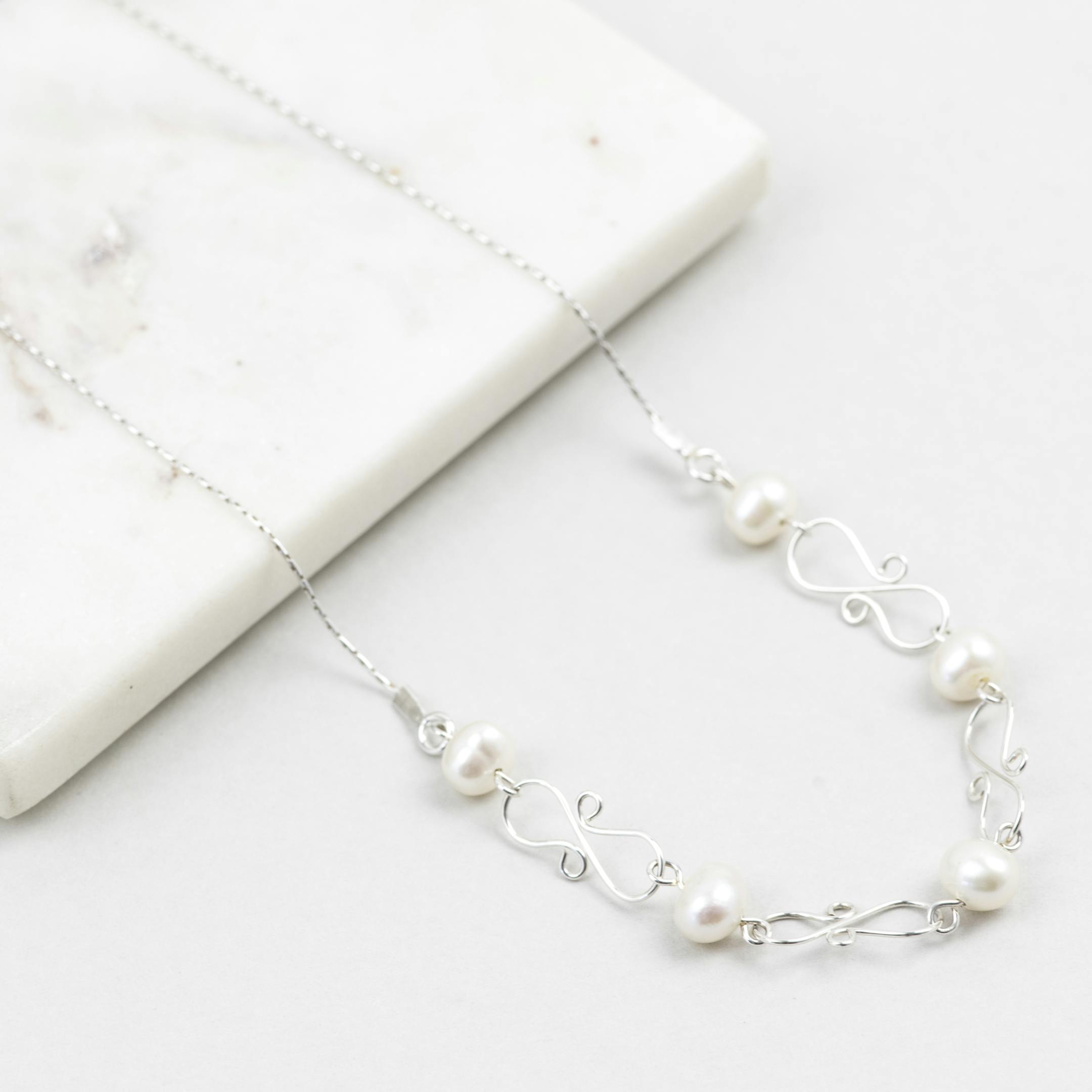 Featuring white freshwater cultured pearls, the Yediah necklace is 18 inches long by 0.25 inches wide. The Yediah design is also available as earrings and a bracelet to create a matching set.