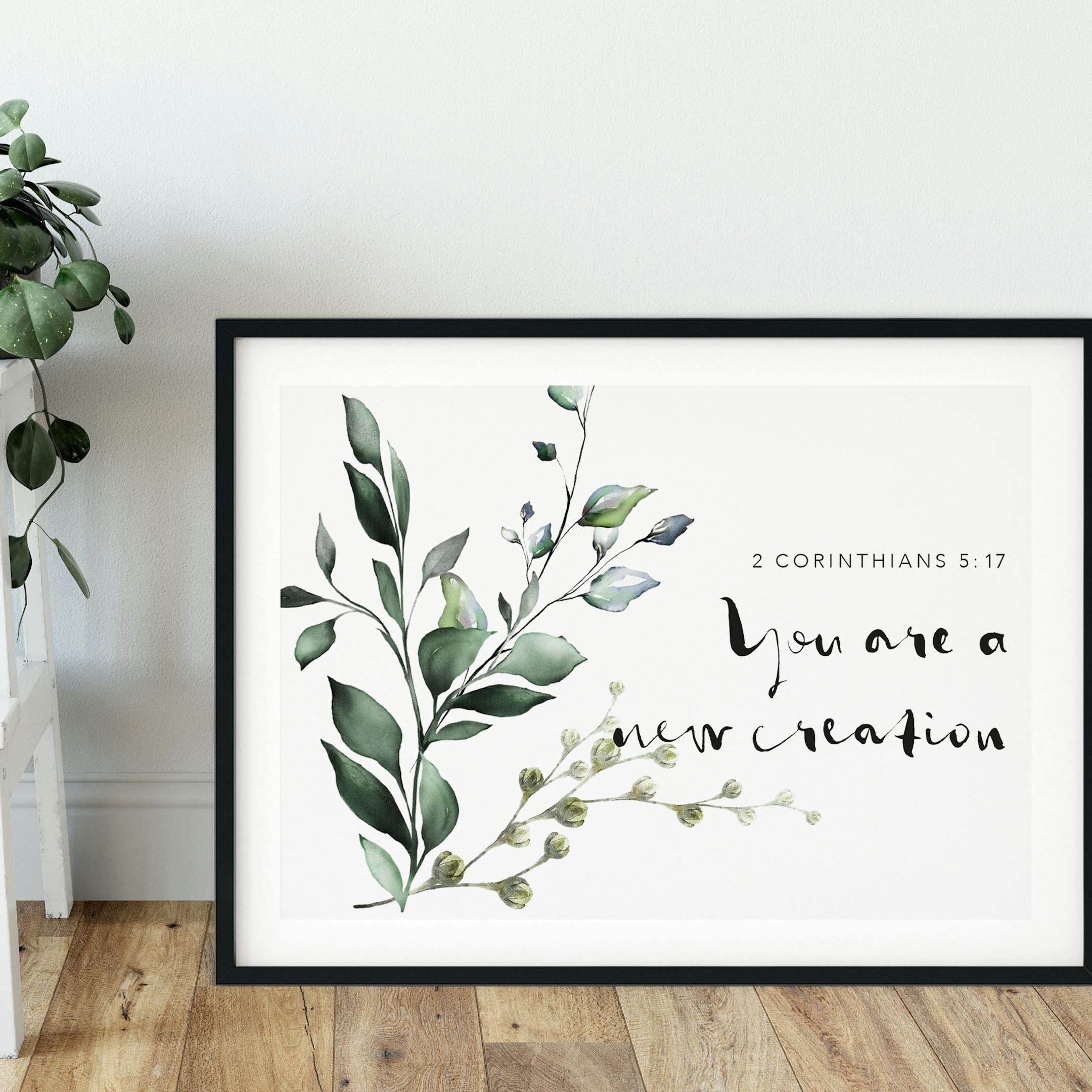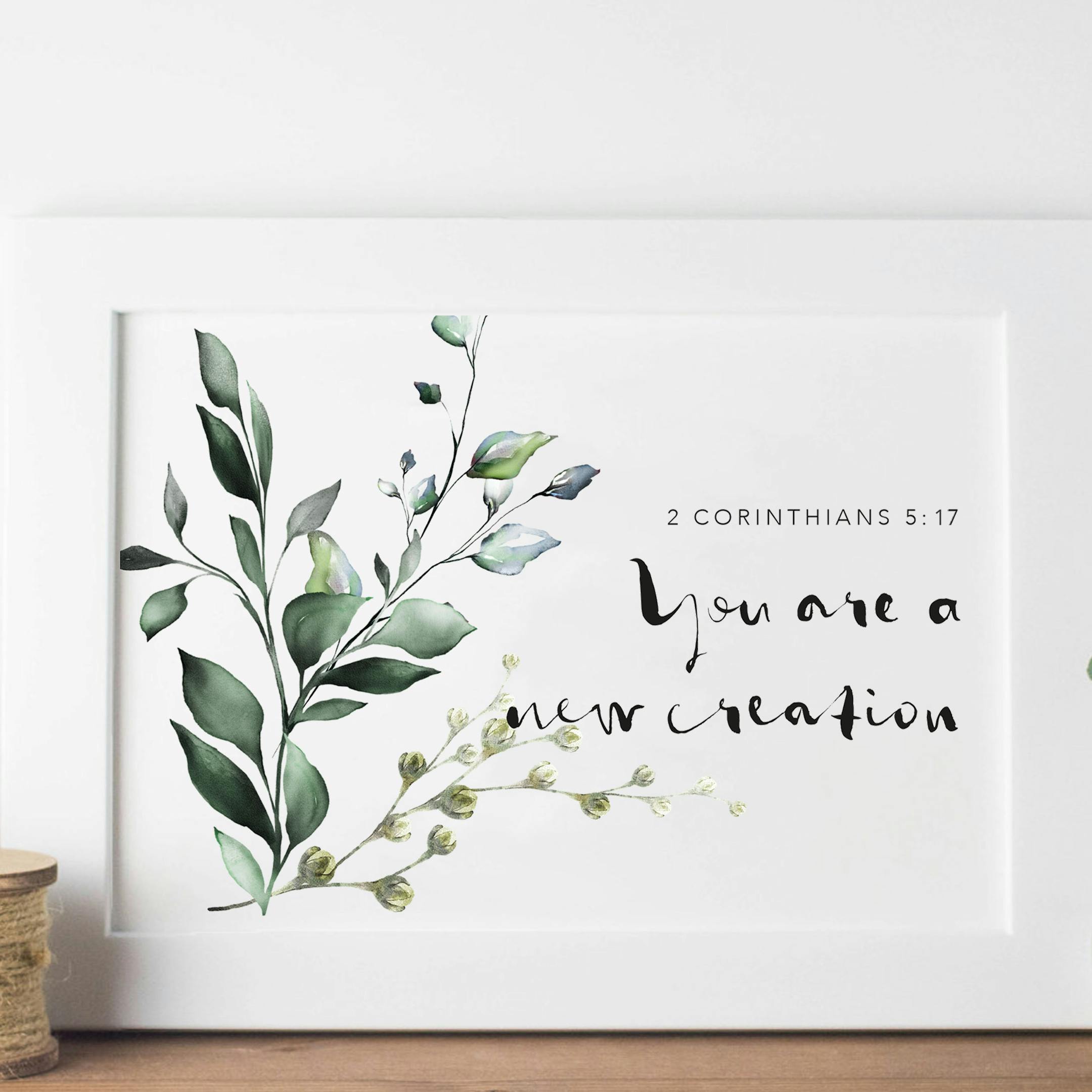 This modern, gorgeous art print features the verse from 2 Corinthians 5:17, 'You are a new creation', in contemporary, black calligraphy that is complimented by soft green watercolour fauna. This print would make a stunning addition to any room. Lovingly created, this print would look great on a wall or a mantle or desk top.