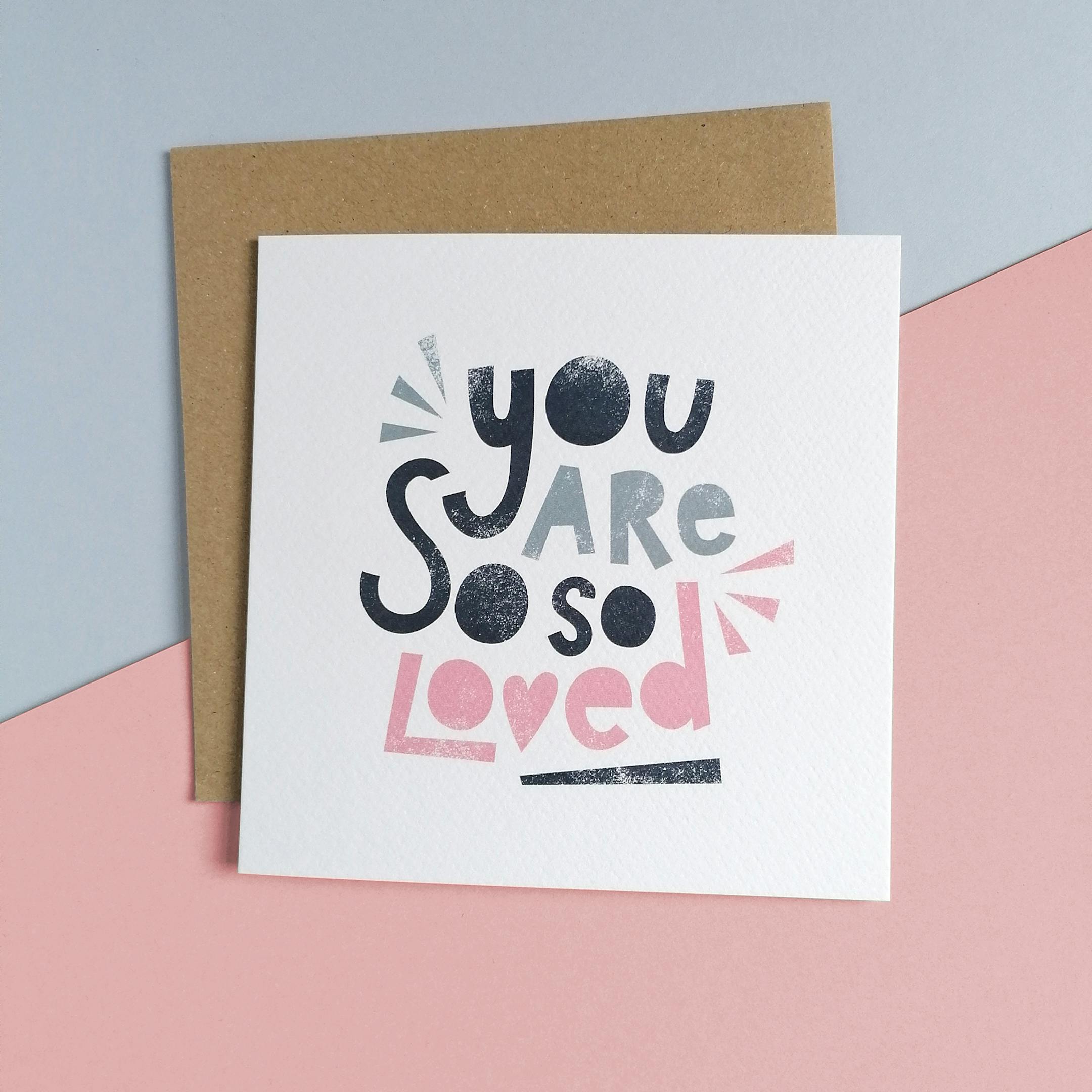 This hand lettered card in a paper cut style is perfect to send to a loved one to tell them how much God love’s them. It is made from high quality textured card and features the words ‘You are so so loved’ Inspired by the bible verse John 3:16. It also works great as an encouragement card, valentines card or anniversary card.
